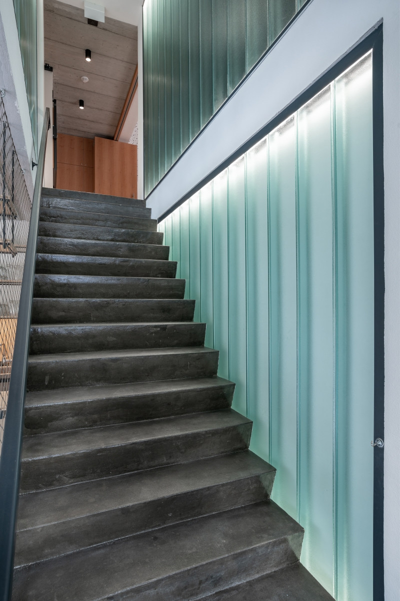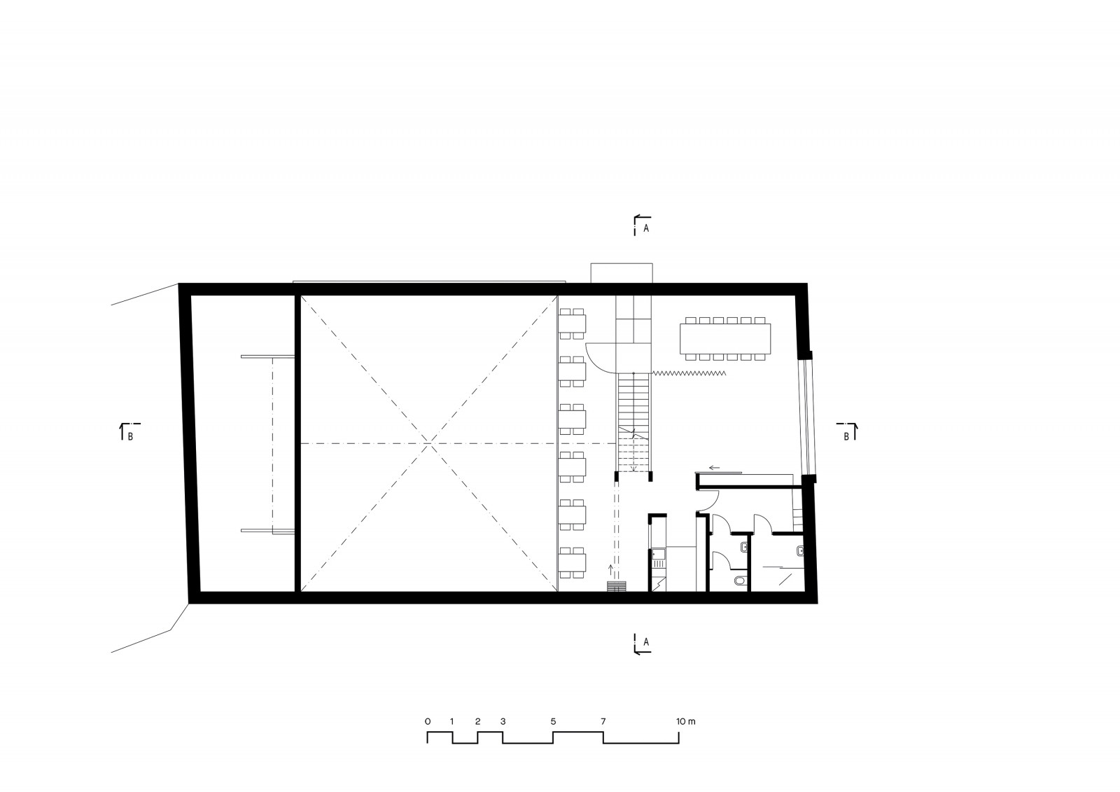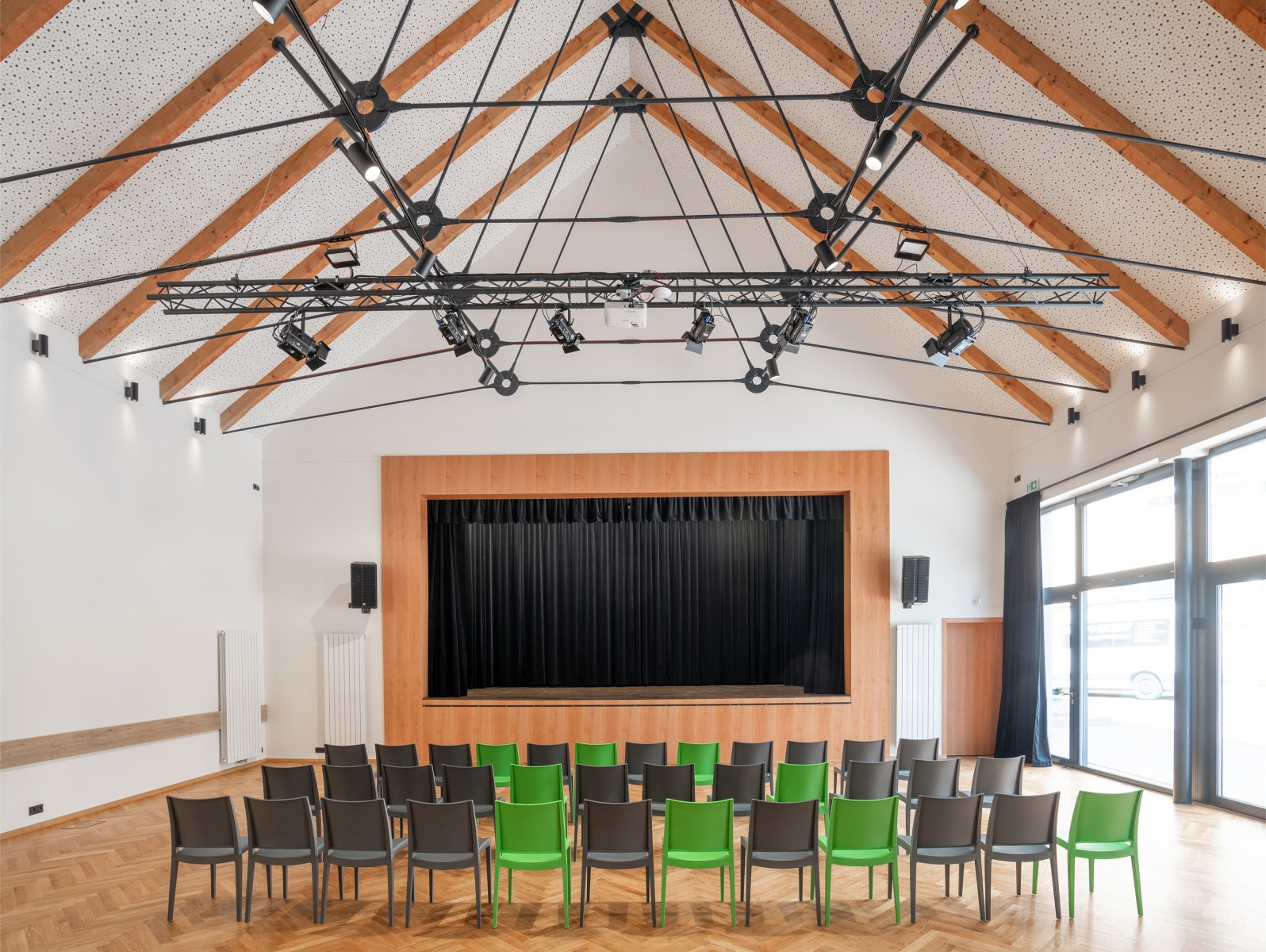Obec si kladla za cíl učinit společenský sál s jevištěm skutečnou chloubu místních obyvatel. Interiér se nese ve znamení kvalitních materiálů, hlavní roli získalo dřevo a kov, který svou tmavou povrchovou úpravou kontrastuje s teplými tóny parket. Vizuální dominantou sálu je otevřený krov se zavěšenou galerií s posezením.