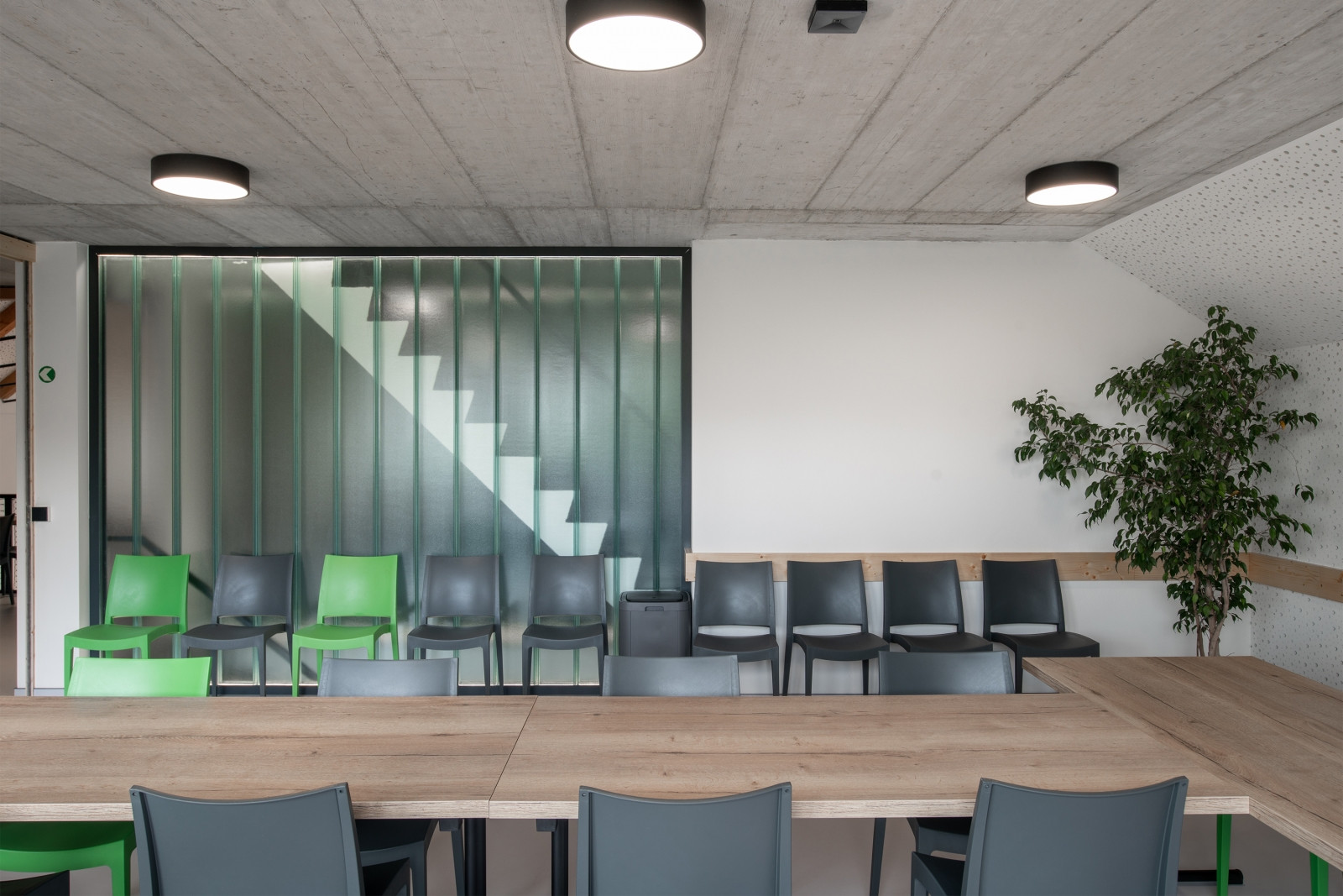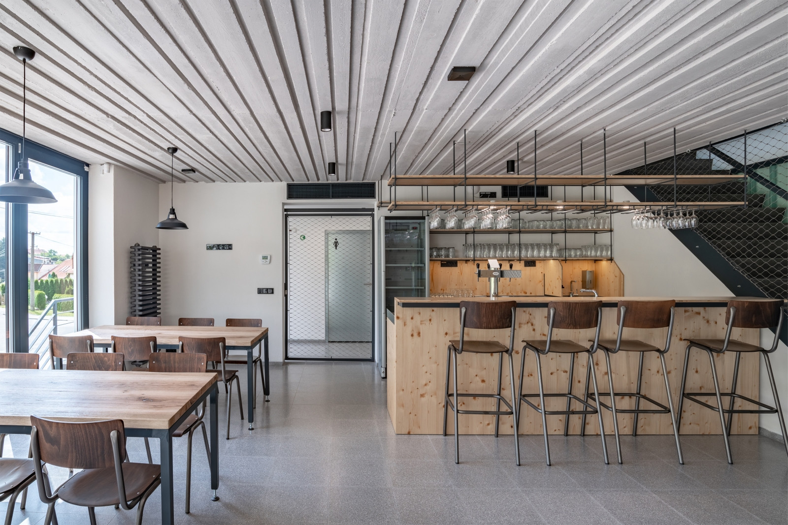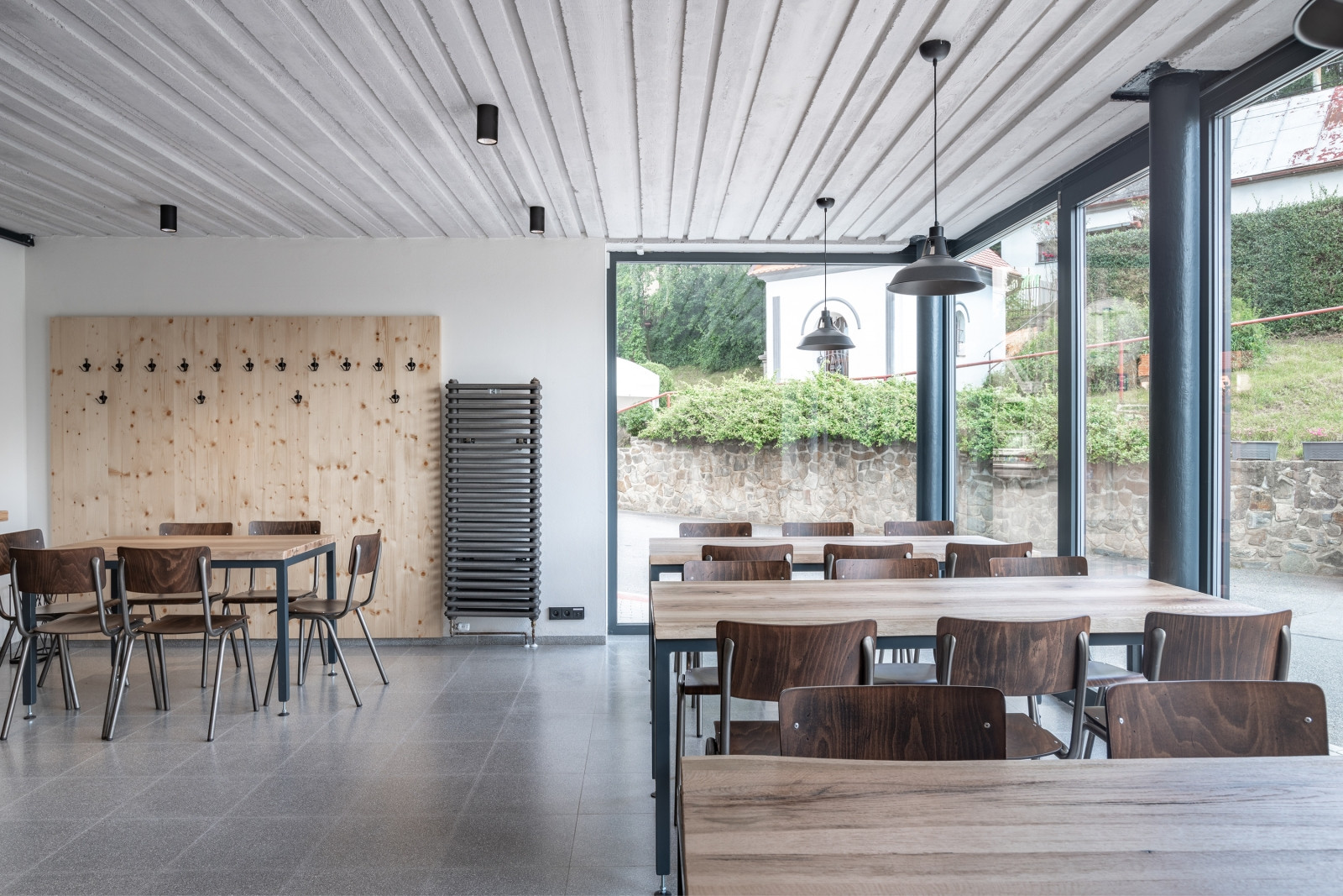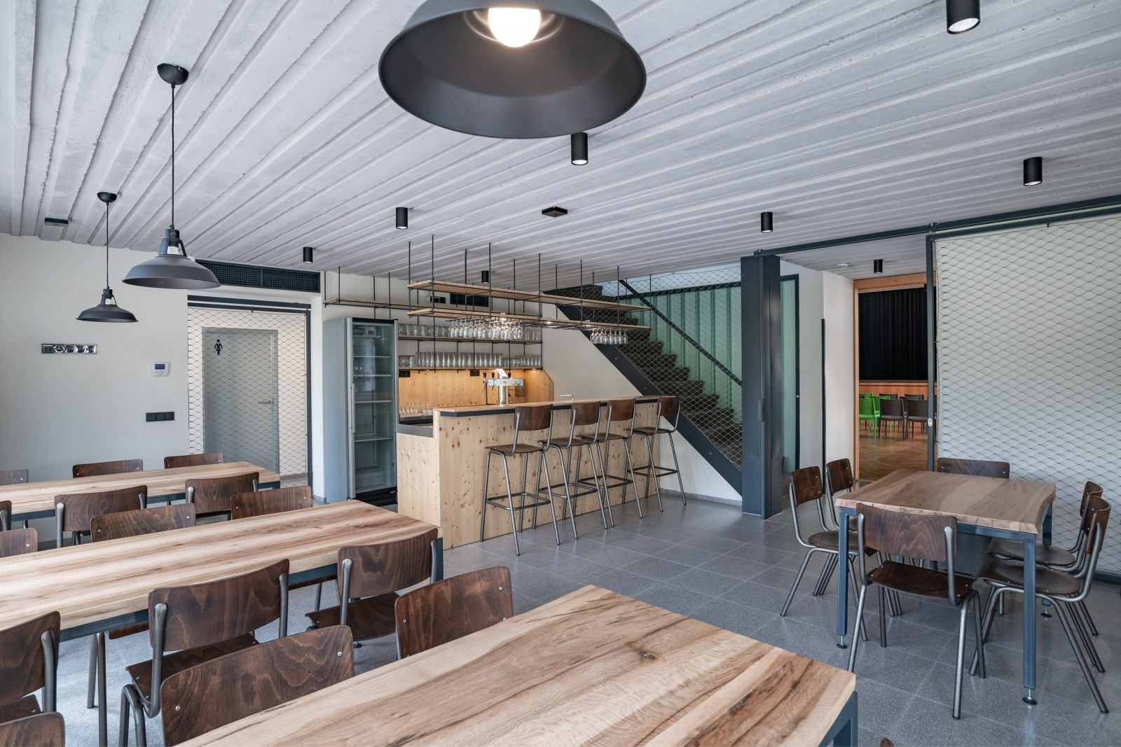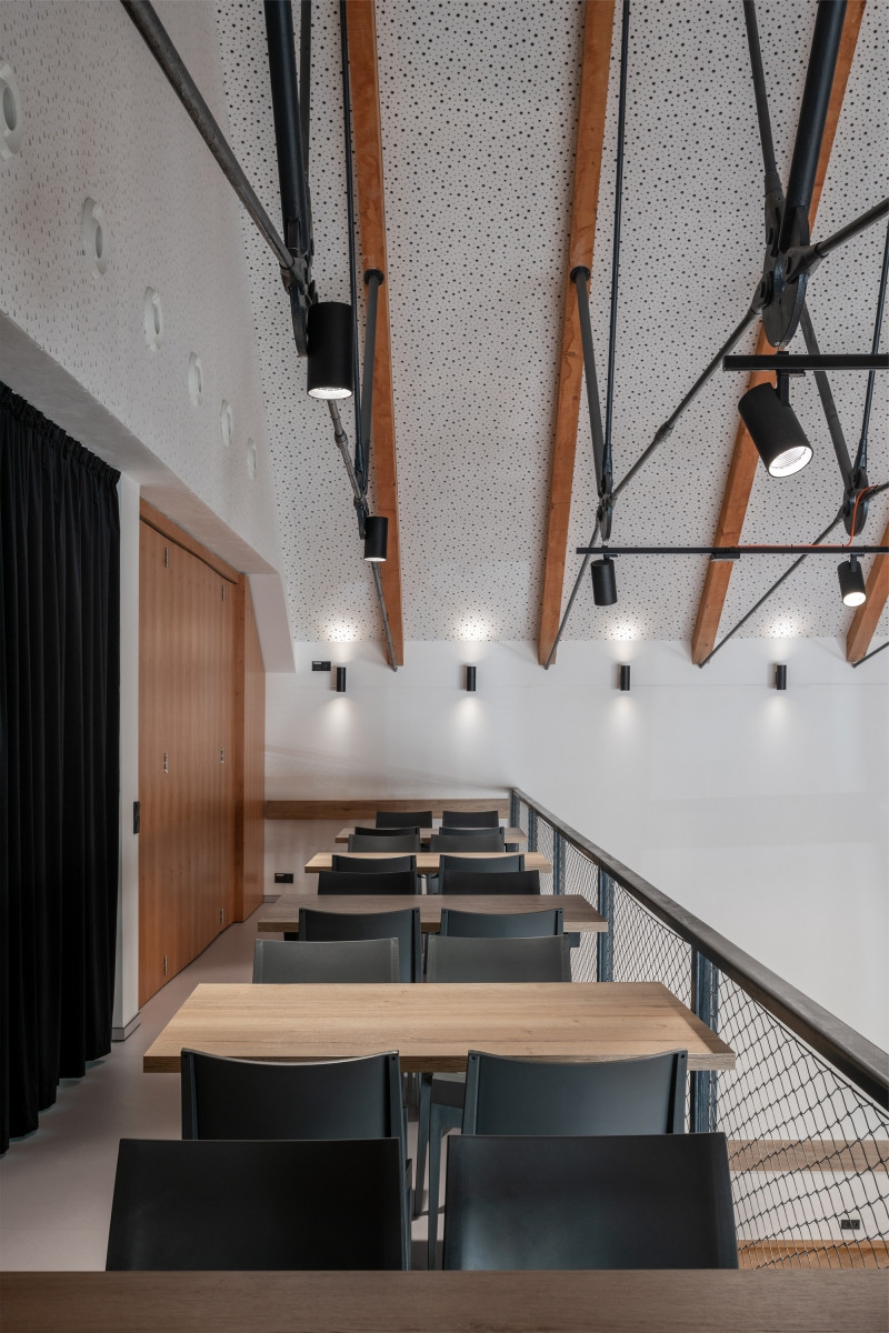 Restaurace se naopak dočkala zejména funkčního a ekonomického vybavení. Dřevěný mobiliář a bar doplňují industriální kovové prvky laděné do stejného odstínu jako ve společenském sále.