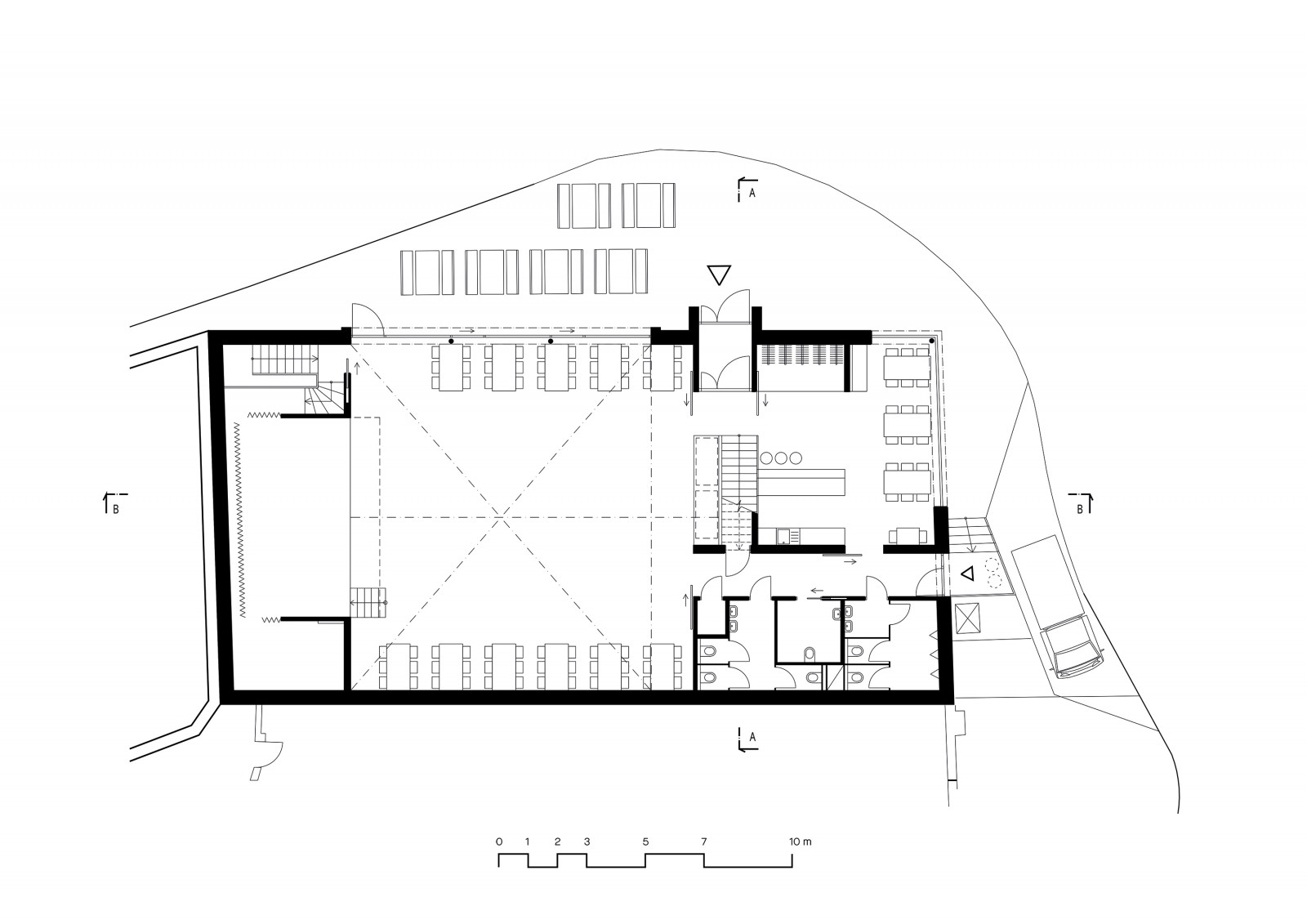 Díky velkoplošnému zasklení v hliníkových rámech Aluprof je možné společenský sál bezprostředně propojit s exteriérem. Jediným dělícím prvkem je totiž francouzské okno. Jelikož se úroveň podlahy sálu přizpůsobuje vydlážděnému předprostoru, je pohyb mezi nimi zcela plynulý.