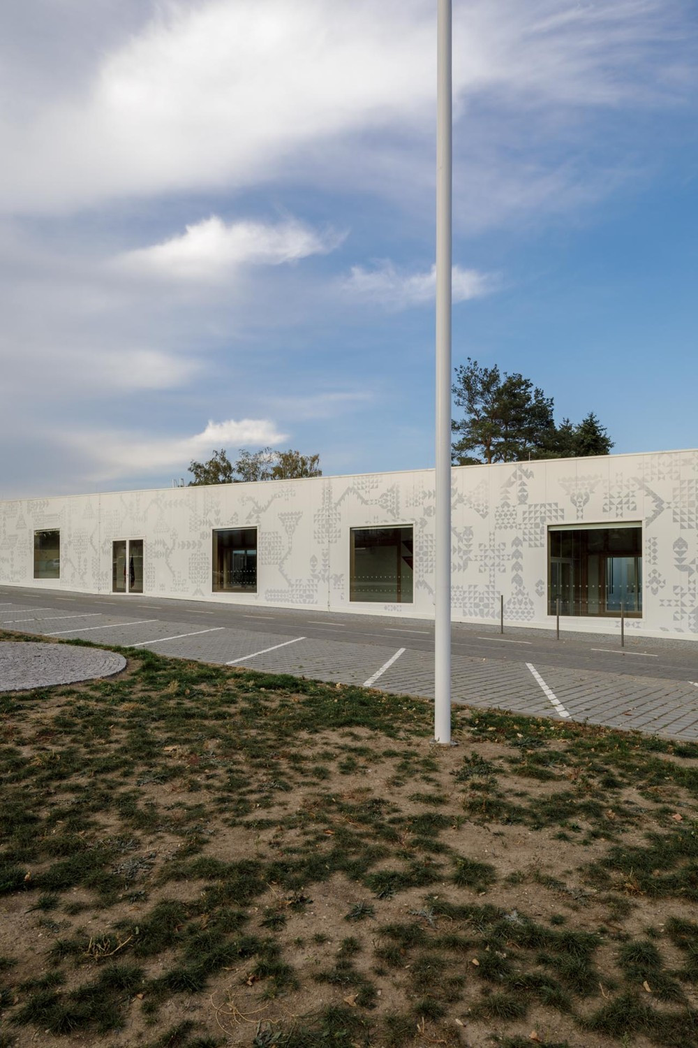Základní nosnou konstrukci stavby tvoří masivní dřevěný skelet v modulu 4 krát 4 metry. Čelní bílé fasády mírně svažité jednopodlažní budovy pokrývá stříbrný reflexní potisk s geometrickým vzorem, který má podle architektů sloužit pro „větší identifikaci občanů s ‚abstraktní krabicí‘”.