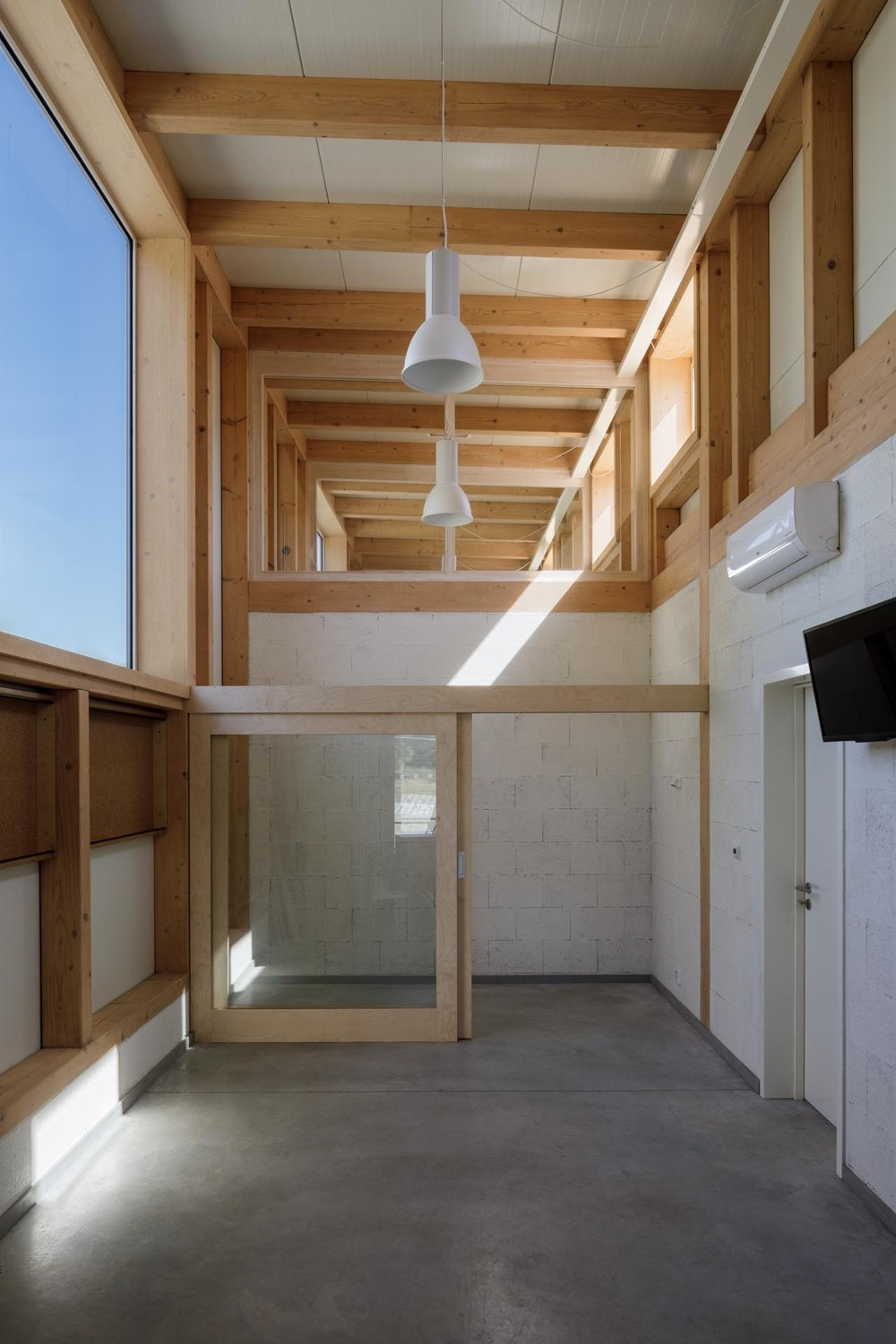 Všechny čtyři části budovy propojuje krytý vestibul v podobě určitého podloubí, který může sloužit také jako rozšíření sálu při společenských akcích nebo jako výstavní prostor. Světlému interiéru dominuje odhalená konstrukce ze světlého dřeva. Díky venkovním pobytovým prostorům mezi jednotlivými částmi domu a velkým oknům se návštěvníkům také otevírají průhledy celým objektem.