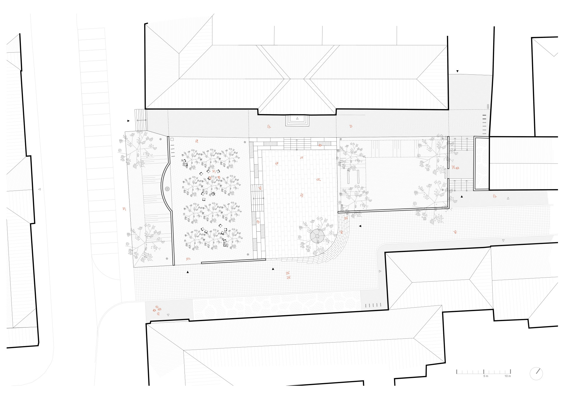 „V rámci projektu byly nahrazeny asfaltové a zámkové dlažby propustnými nebo částečně propustnými povrchy z přírodních materiálů, které jsou pro místní kraj charakteristické. Ústřední plocha je tvořena velkoformátovou kamennou dlažbou 40x60 cm z místní žuly, pobytová plocha pod muchovníky je provedena z mlatové skladby s lomovou prosívkou světlého odstínu. Pochozí plochy a vstupní prostor obchodní akademie je tvořen drobnou žulovou dlažbou kladenou do řádku,“ detailně popisují autoři a autorky.