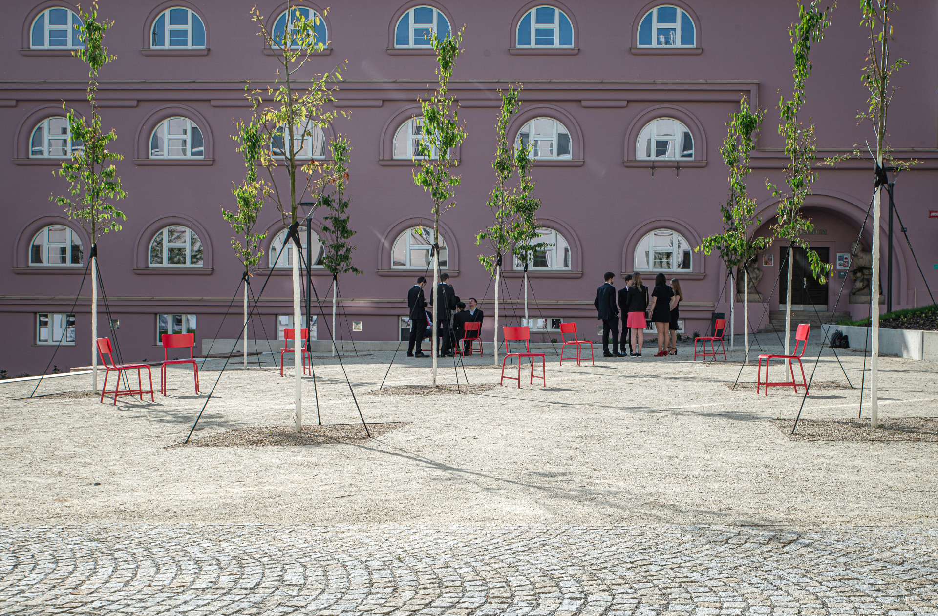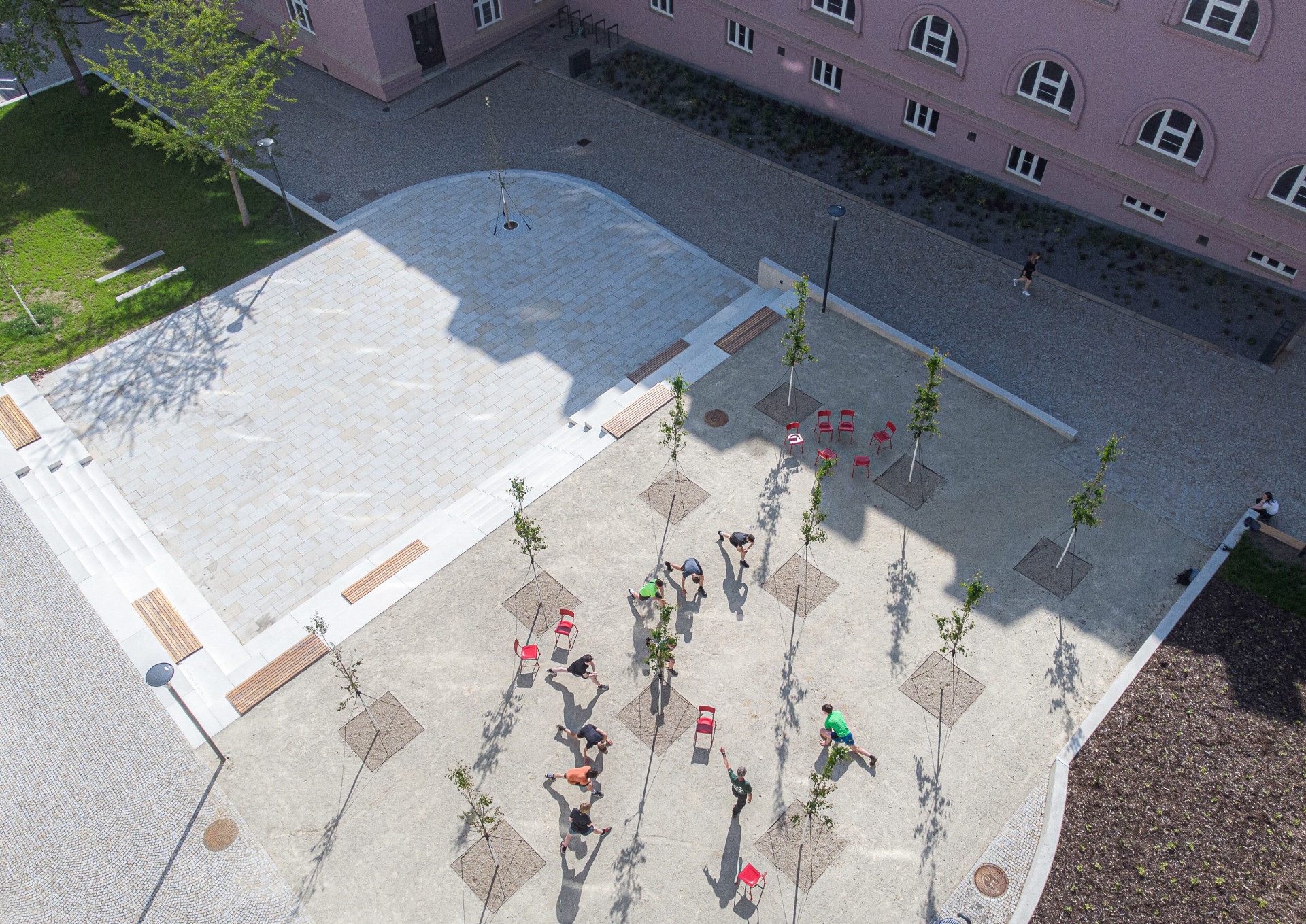 Původně nepřívětivé místo se stalo novým veřejným prostranstvím. Probíhá tu venkovní výuka i společenské akce.