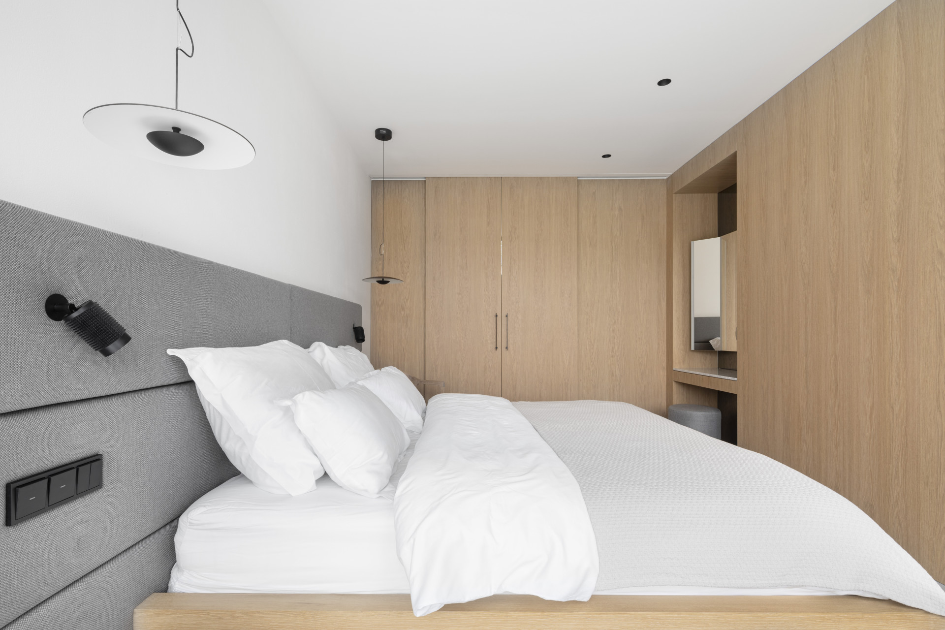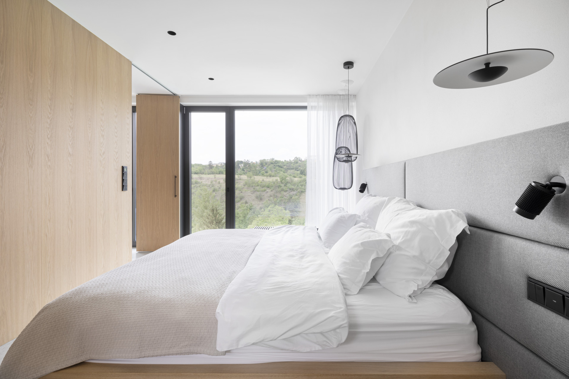 Soukromé části s výhledem na zeleň, která jako by z okolí vstupovala přímo do interiéru, nechybí čisté linie a nadčasové vybavení. Jako základ osvětlení zvolili architekti vestavná bodová svítidla Deep Ringo. Tato všestranná stropní svítidla elegantně propojují prostory a zajišťují celkové osvětlení většiny místností. Světelný koncept ložnice bylo potřeba vyladit s ohledem na velkou prosklenou plochu tak, aby prostor nepřesvětlila. Jako lampičky na čtení byly zvoleny reflektory Punk s ostny na povrchu, které vnesly do interiéru zcela nový prvek ikonické subkultury 70. let minulého století, individualismu a kreativity. Doplněny jsou o závěsná svítidla Ginger od značky Marset, jejichž ultratenká stínidla ve tvaru talíře jsou vyrobena z tenké vrstvy dřevěné dýhy a papíru.