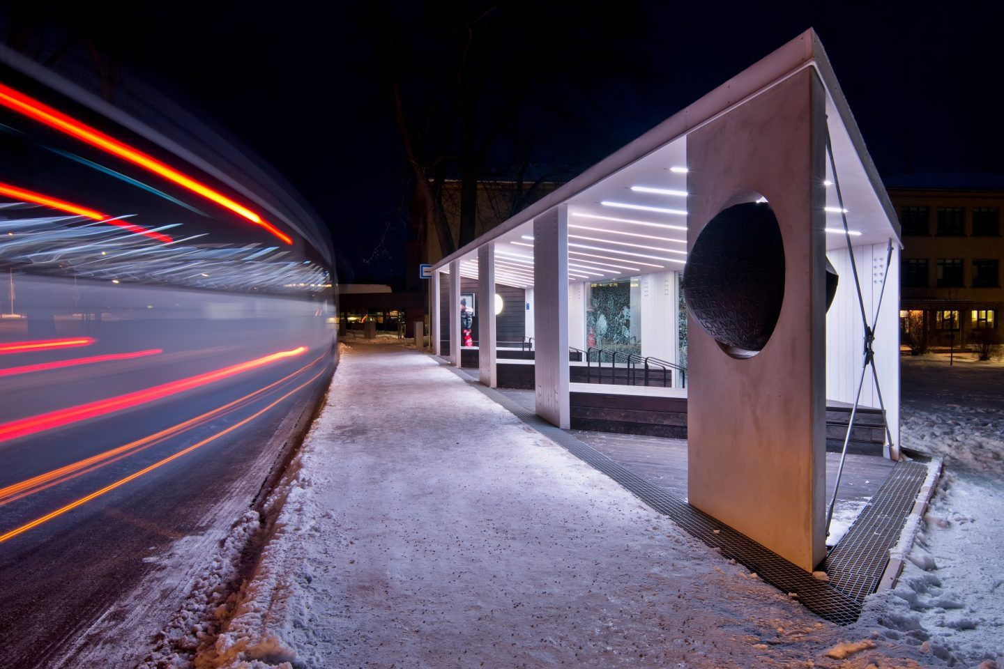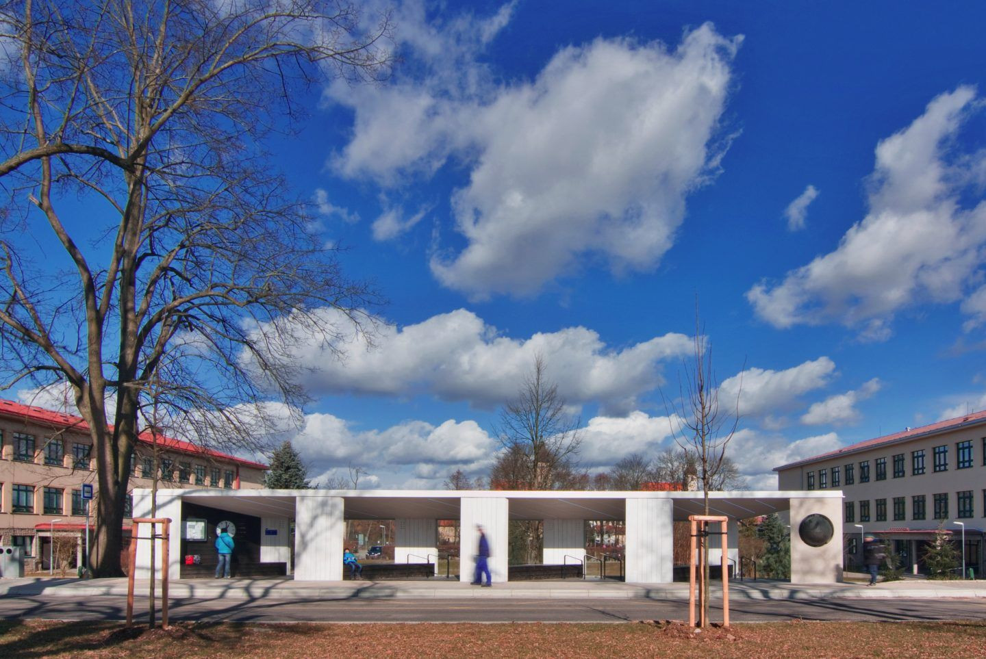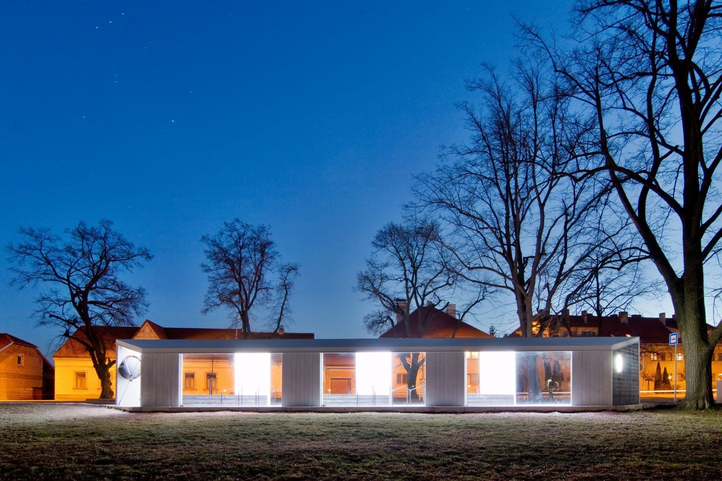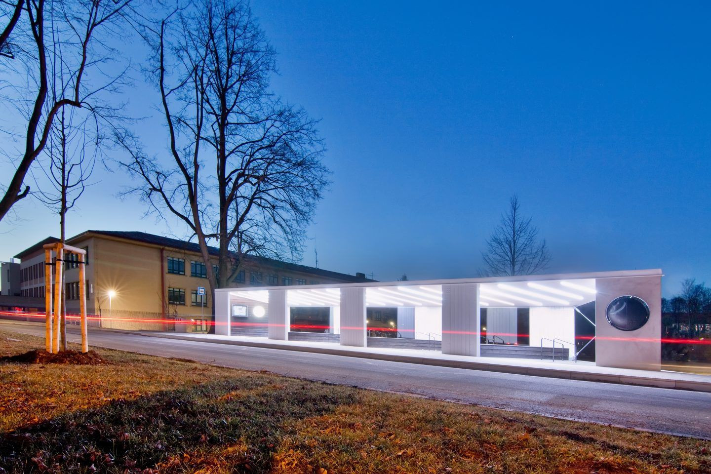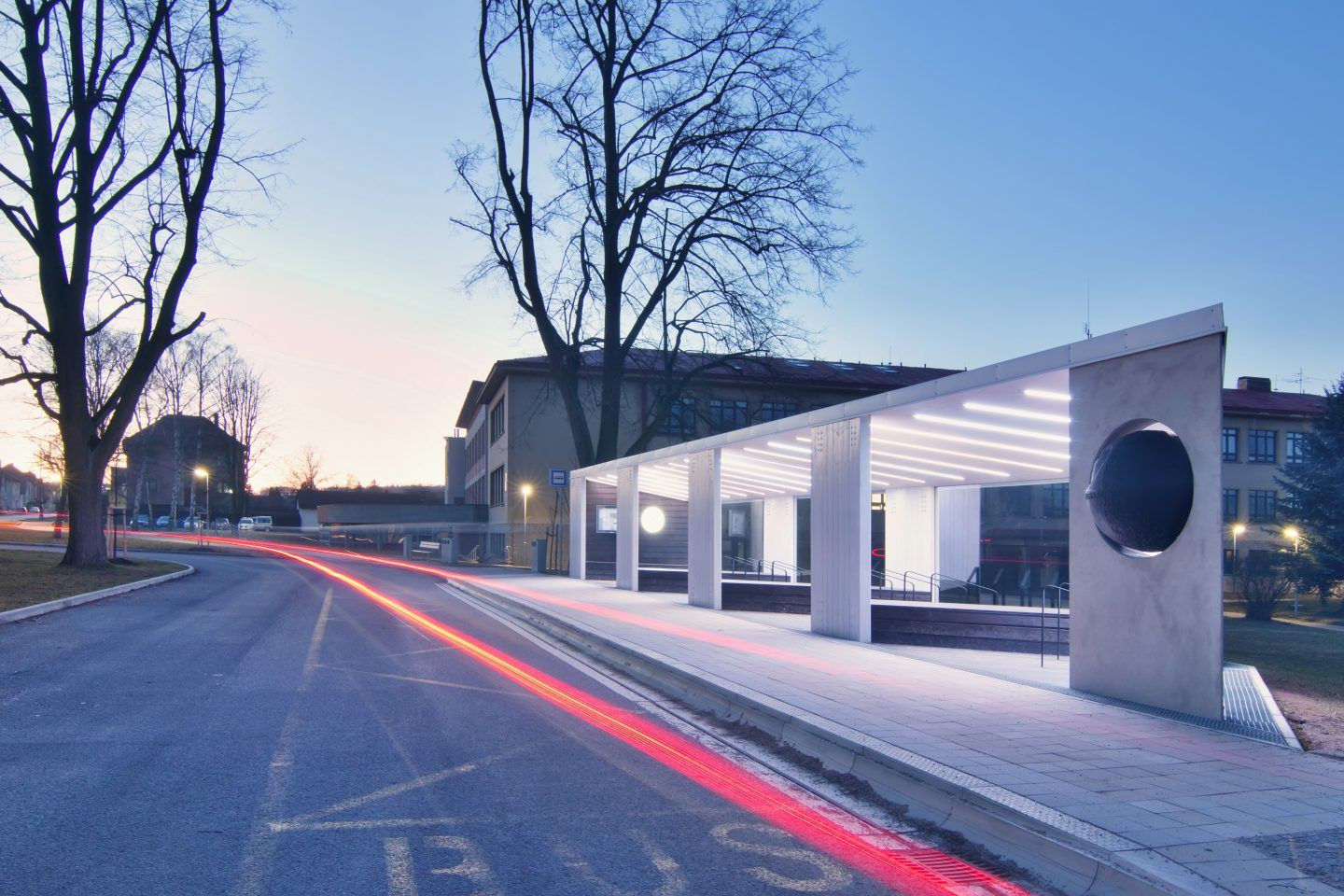 Jedno město, stovky cestujících, jeden přístřešek - objekt zářící, o čase informující a před deštěm, větrem, sněhem a sluncem nejen cestující, ale i historii chránící... Autobusový záliv, dnes již místními nazývaný Gagarin, vznikl v nevyužívané ploše mezi základní školou a gymnáziem a nyní je nominovaný na Českou cenu za architekturu.