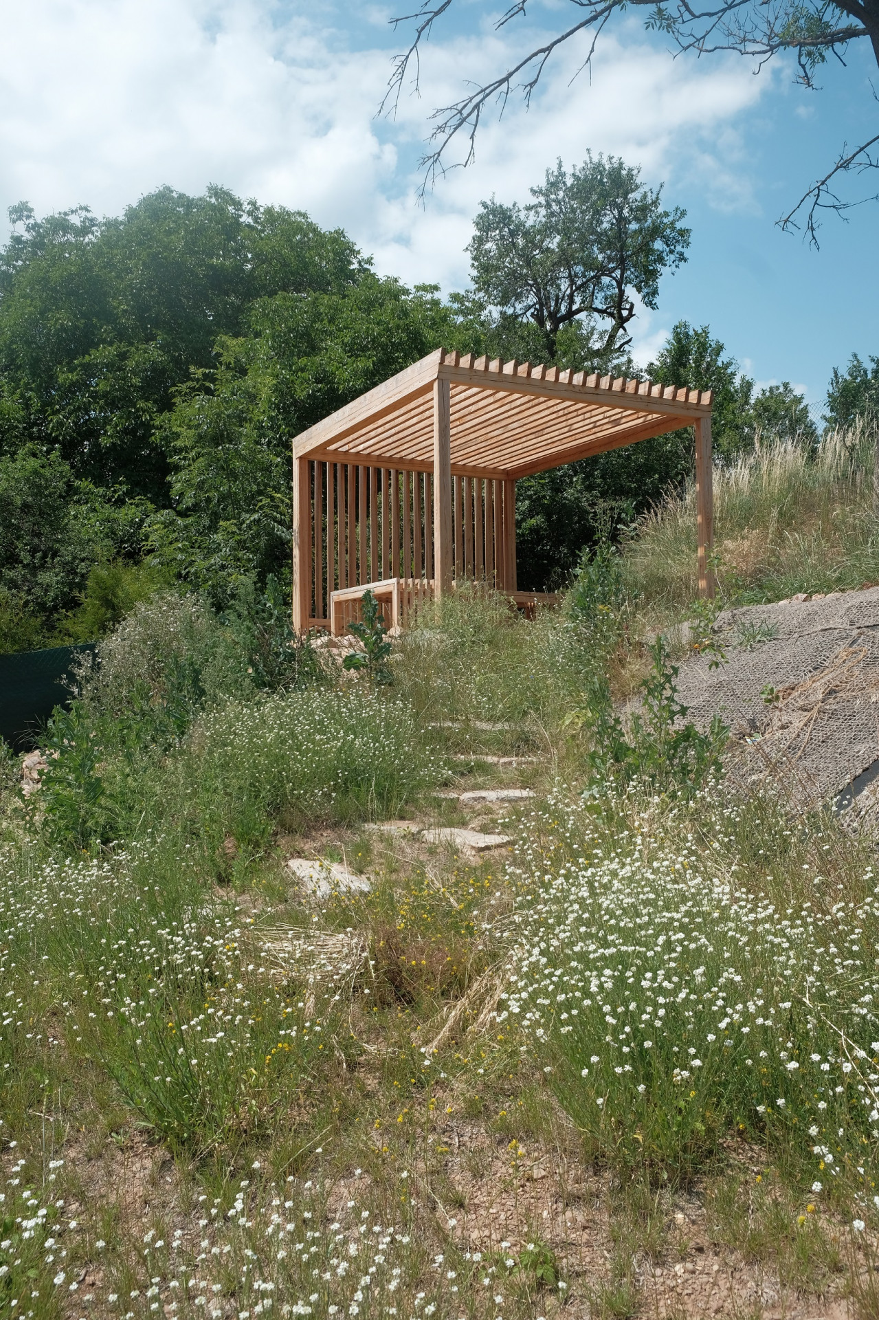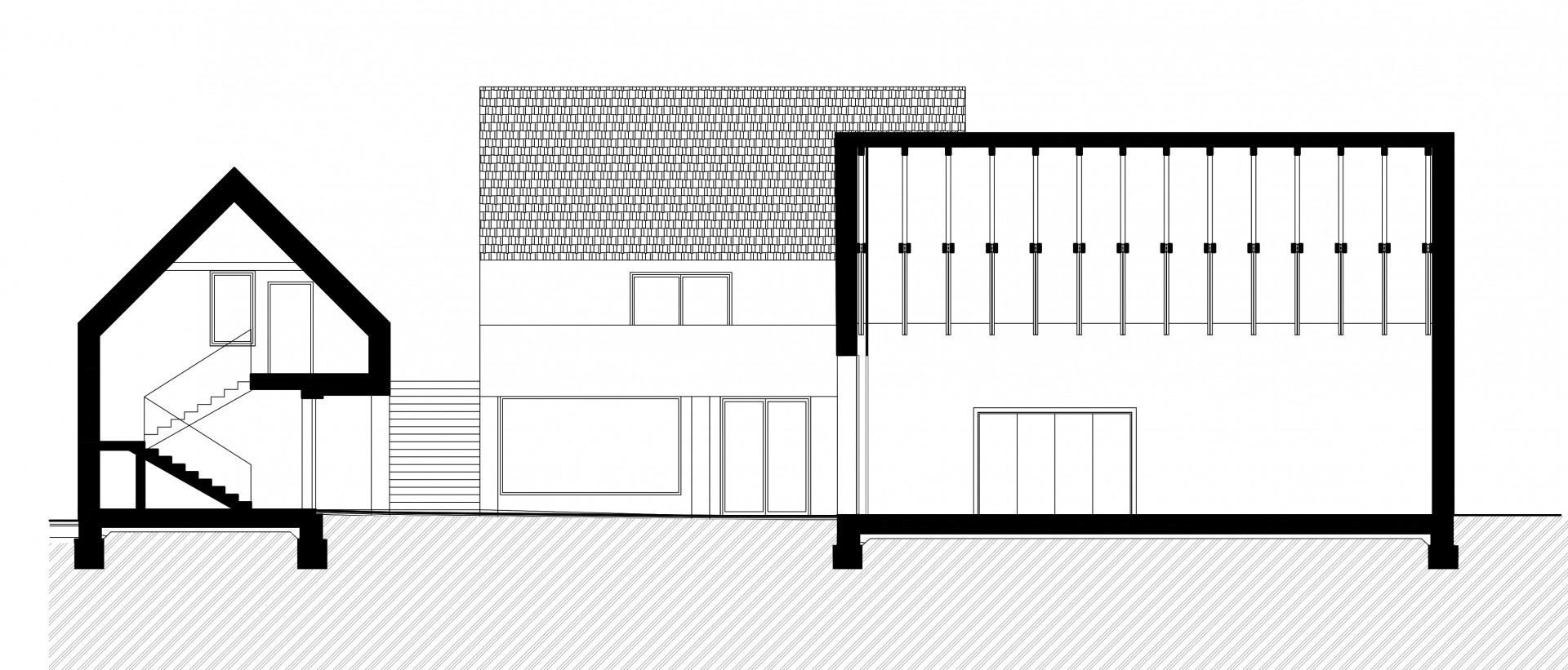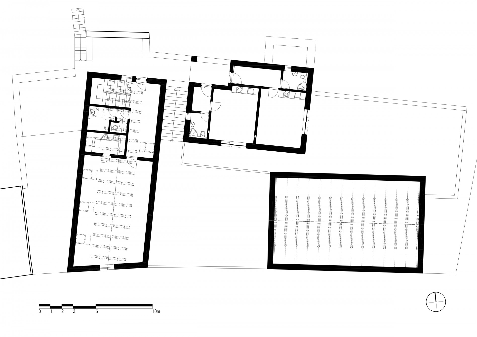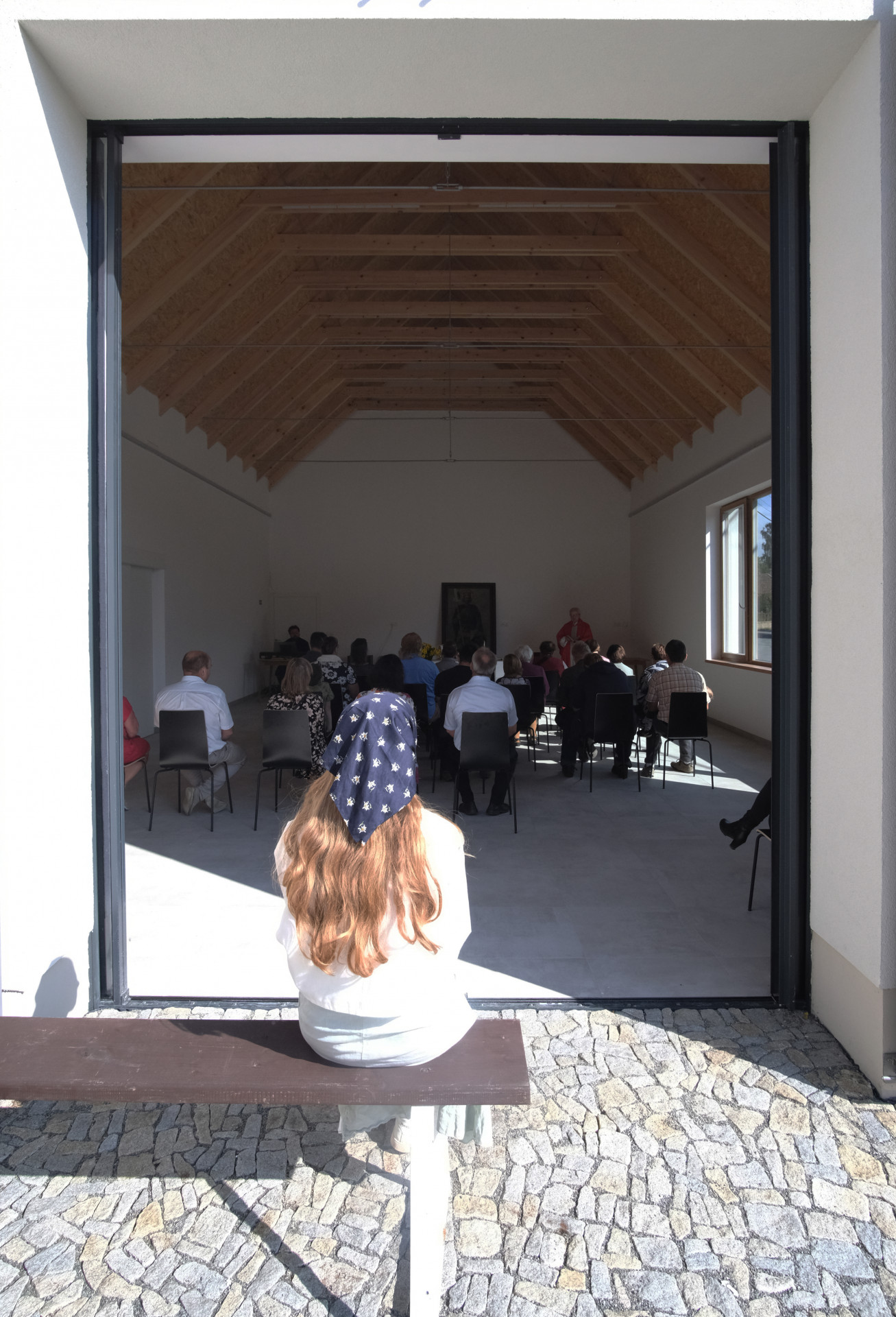 Společenský sál, který pojme až 100 lidí, se skrze francouzská okna propojuje s dlážděným nádvořím. Do objektu je dokonce integrovaná i autobusová zastávka – zakousává se přímo do západního „domku“. Do zahrady ve svahu se zase dá vystoupat po betonovém schodišti.