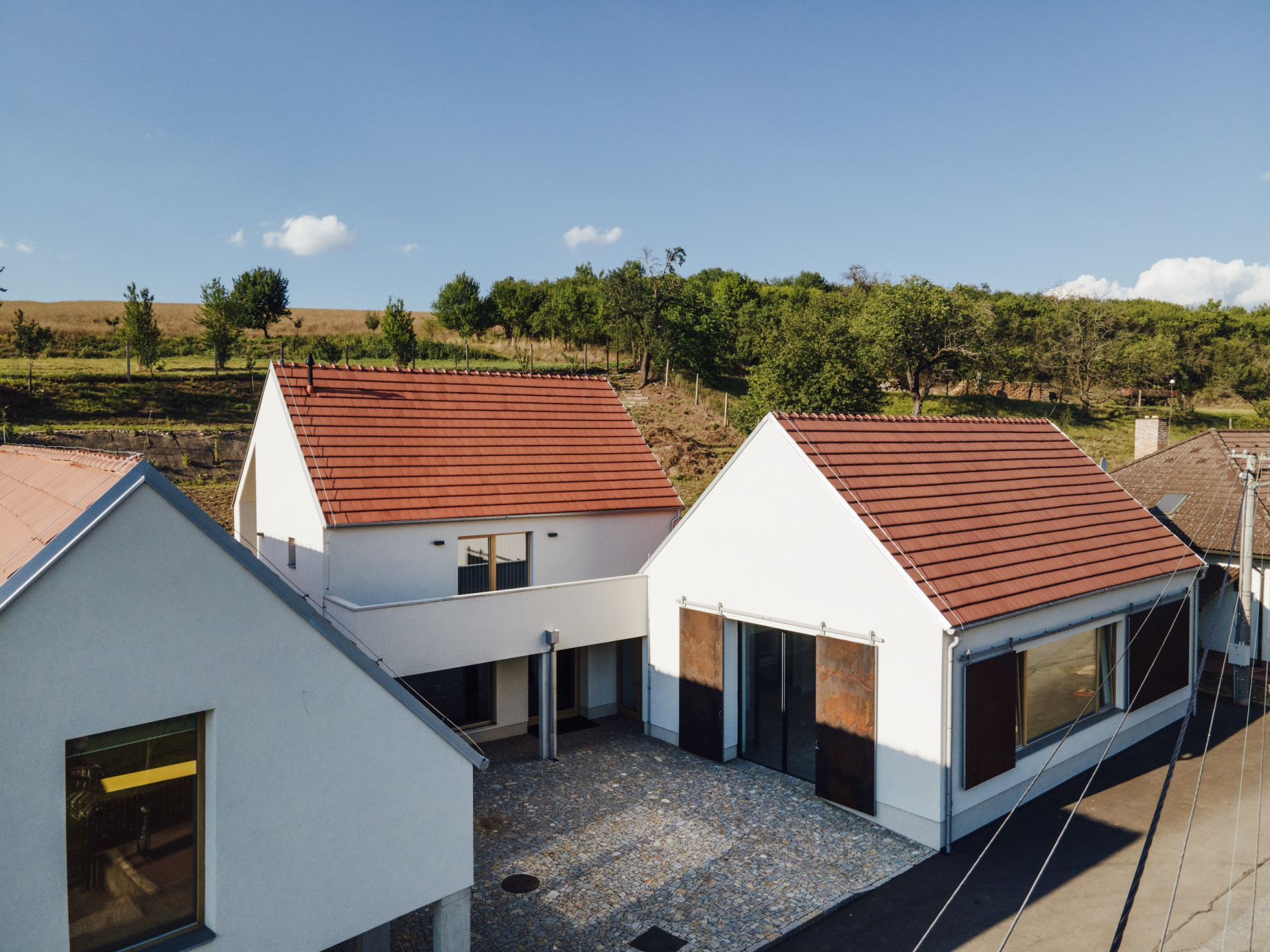 „Seskupení tří těles zapadá do urbanistické struktury vesnice a rozšiřuje veřejný prostor o drobné nádvoří, z něhož je po schodech volně přístupná obecní zahrada ve svahu nad domem,“ popisuje autorka. Všechny hmoty jsou vzájemně propojené vydlážděnými plochami, některé případně i přízemními plochostropými přístavbami, které záměrně zůstávají vizuálně neexponované.