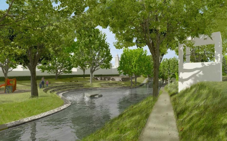 Protáhlý městský park je ohraničen chodníkem v ulici Vodní valy a nově navrženým chodníčkem u hladiny Loučné podél jejího pravého břehu. Tato promenáda přirozeně naváže na již zrealizované nábřeží na severní straně území a umožní dosud chybějící přístup k řece. Promenáda se skládá ze tří typů chodníků. Mlatový chodník spojuje stávající kamenný most s břehem řeky. Kamenné zpevněné nábřeží navrhujeme v místě zálivu a v jižní části řešeného území, kde náplavka již částečně existuje a je nutno ji pouze obnovit. Tyto dvě zpevněné části promenády spojuje visutý chodník, který pomocí pouze lokálních podpor levituje nad přírodním břehem Loučné. Spolu s promenádou je zásadní součástí našeho konceptu vytvoření zálivu, který bychom chtěli nabídnout jako přírodní brouzdaliště dětem i dospělým. Břeh řeky je v tomto místě řešen stupňovitými terasami, které budou sloužit jako posezení. Věříme, že se záliv stane přirozeným těžištěm celého území. Park je po délce členěn příčnými chodníky spojujícími ulici s nábřežní promenádou. V parku jsou pak pod stromy rozmístěny hřiště, pobytové trávníky a terasa restaurace s navazujícím hřištěm na pétanque. Vybavení dětského hřiště je použito stávající, jednotlivé jeho prvky jsou přemístěny, jejich povrch navrhujeme sjednotit a uspořádat do vzájemně se dotýkajících kruhů. Všechny louky a terasy jsou navrženy v jejich stávající niveletě. Výškové rozdíly mezi jednotlivými plochami jsou řešeny formou kamenných schodů, opěrných zídek a svahů.