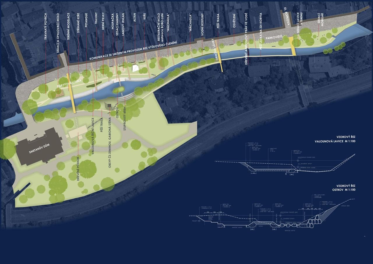 Návrh se soustředí na zapojení obou břehů řeky do organismu sídla v poloze na rozhraní sídelního historického jádra a mladší obytné čtvrtě s několika školami. Pravý břeh je navržen využívat pobytově odpočinkově a levý zprůchodněn a zapojen do parku. Návrh respektuje využitím, provozem i materiály přírodní charakter území s ohledem k trasování biokoridoru řekou a poloze biocentra v parku stejně jako s ohledem na záplavové území. Park u Smetanova domu je navržen propojit novou trasou a pěší lávkou s oběma břehy řeky. Opticky a funkčně jsou podpořeny příčné vazby uličního a nábřežního prostoru.