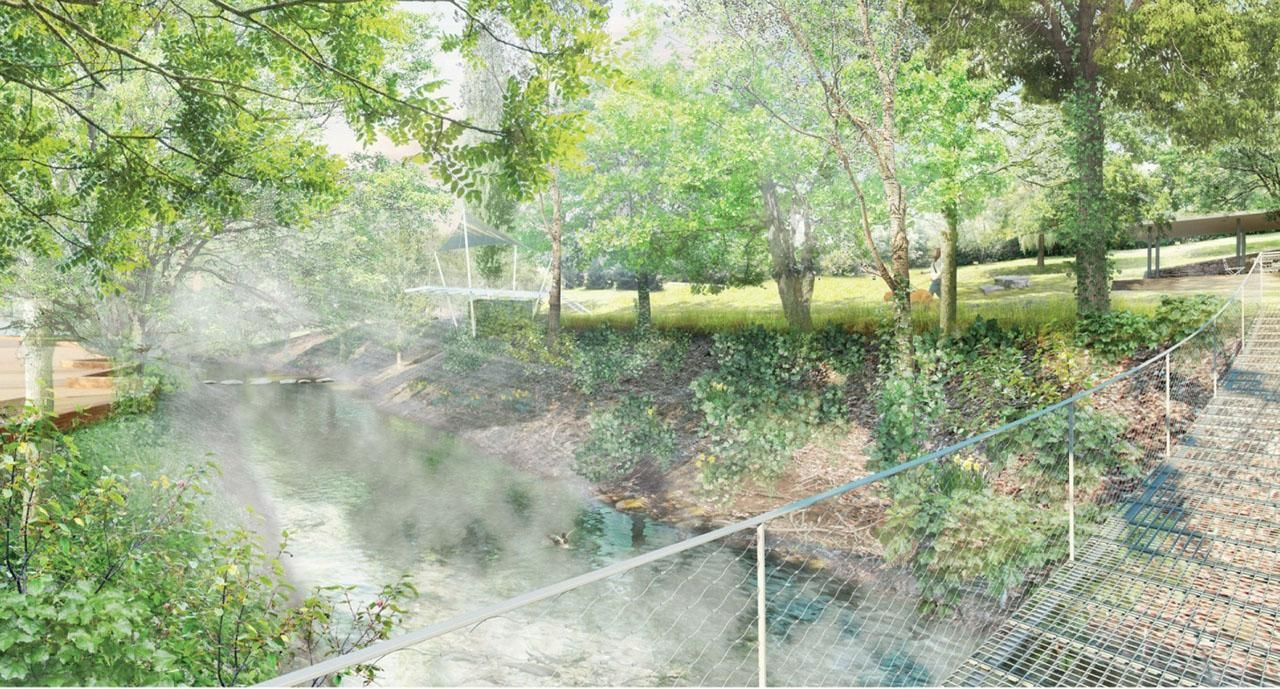 Propojení prostorů zajistí nová pěší lávka a stezky vedoucí přes přechod z kamenů v řece.