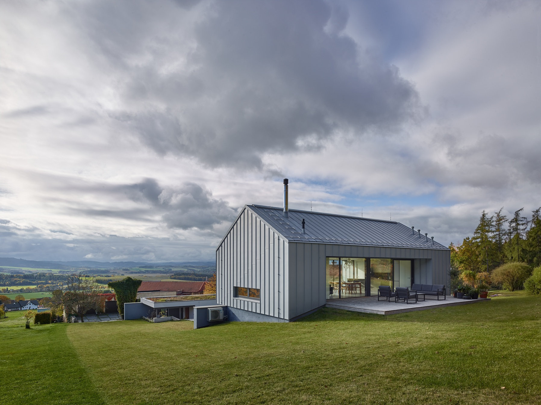 Na okraji vesnice u Klatov vznikl rodinný dům s obrácenou logikou dispozice. Ložnice jsou v přízemí, obývací pokoj naopak v patře. Právě odtud se otevírají výhledy do krajiny.