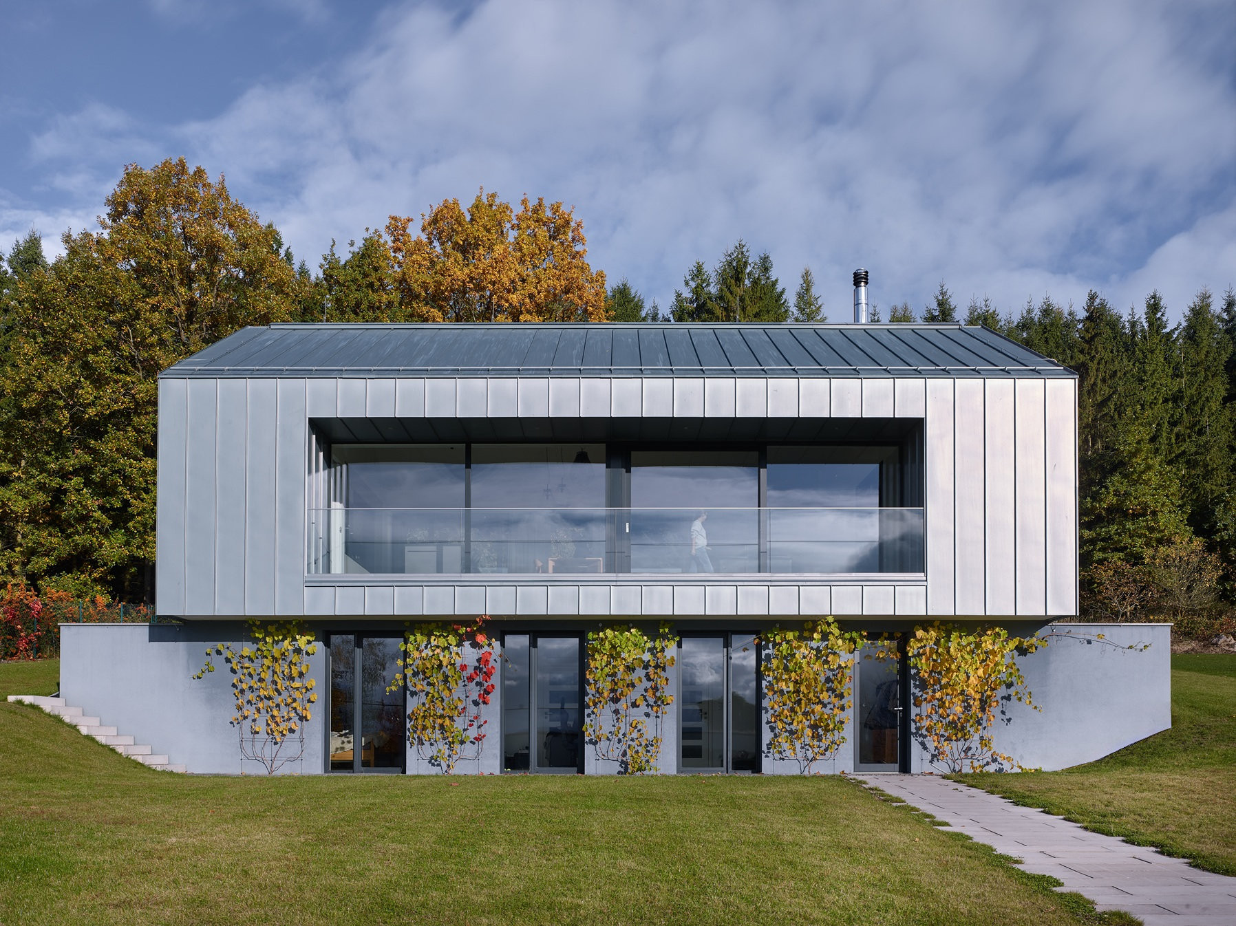 Hlavní vstup do domu vede z přízemí. Svažitým pozemkem k němu směřuje dlážděný chodník od vstupní zóny s garáží, kterou architekti umístili blízko příjezdové komunikace. Právě odtud se dům vyjevuje v celé své hmotě i materiálovém řešení – na spodní podlaží z keramických tvárnic se šedivou omítkou nasedá horní patro opláštěné titanzinkovým plechem.