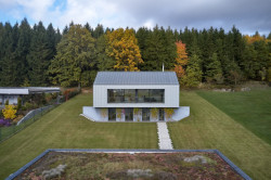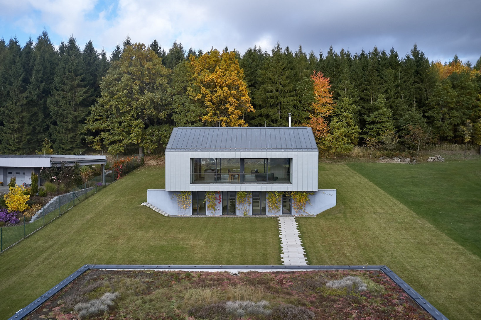 Na rozhraní zástavby a lesa, v místě, kde se vesnice pomalu rozpouští v krajině, stojí rodinný dům navržený ateliérem Stempel & Tesař architekti. Jeho hlavní charakteristikou je, že se „zakousává“ do terénu – architekti využili svažitý pozemek a stavbu do něj částečně zapustili. Opticky se tím zmenšil její objem.