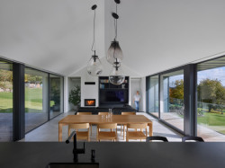 Do obývacího pokoje, který se nachází v patře, je naopak potřeba vystoupat po schodech. Místnosti to ovšem dává její hlavní přednost – protože je už nad terénem, může být téměř průhledná. Architekti toho dosáhli tím, že proti sobě postavili dvě stěny s velkoformátovým prosklením.