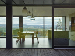 „Na stěny ze skla navazují lodžie po obou delších stranách domu, na které se vstupuje posuvnými dveřmi,“ dodávají architekti. Severní lodžie je orientovaná k lesu a přechází v prostornou terasu. Jižní lodžie svým přesahem chrání interiér před přehříváním a vytváří další příležitost pro venkovní posezení – tentokrát s výhledem dolů ze svahu.