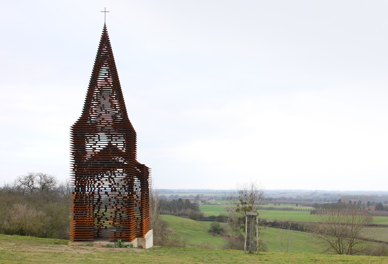Dvojice mladých architektů Pieterjan Gijs a Arnout Van Vaerenbergh navrhla do belgické krajiny objekt na pomezí uměleckého díla a budovy. Do venkovského prostředí regionu Haspengouw architekti umístili otevřenou ocelovou konstrukci ve tvaru kostela, jejíž podoba a charakter se mění v závislosti na úhlu pohledu pozorujícího. Projekt s názvem Reading between the linesvznikl v rámci landartového projektu Z-OUT, který iniciuje Museum současného umění Z33.