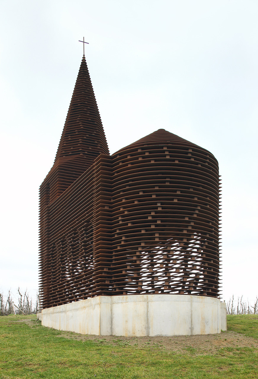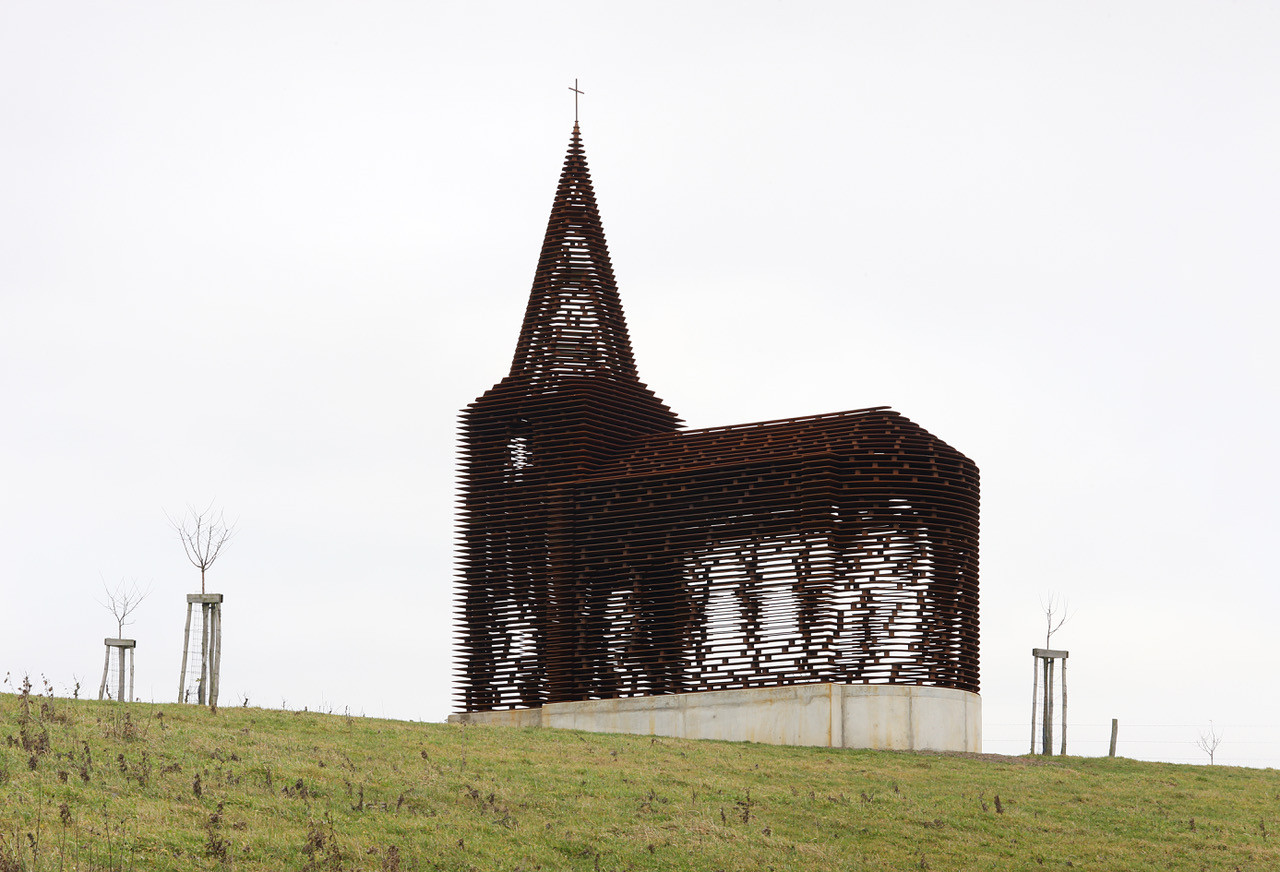 Ocelový kostel od studia Gijs Van Vaerenbergh splývá s krajinou belgického venkova