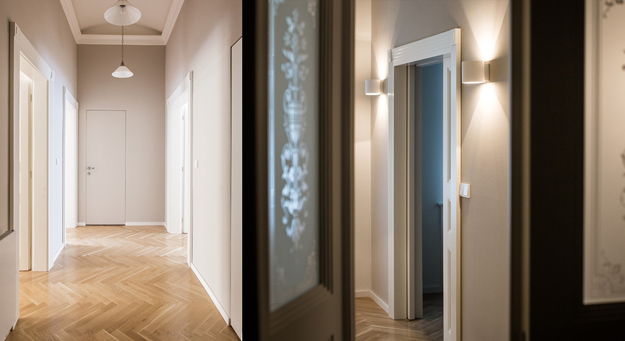 Rekonstrukce v Šumavské byla jednoznačně výzvou, která měla snoubit staré s novým. Hlavním požadavkem klienta totiž bylo zachování „původního“ rázu vinohradského bytu, který se nachází ve staré činžovní zástavbě. Vedle nezbytného moderního zařízení tak můžeme najít renovované dveře nebo stávající parketové podlahy. Paráda!