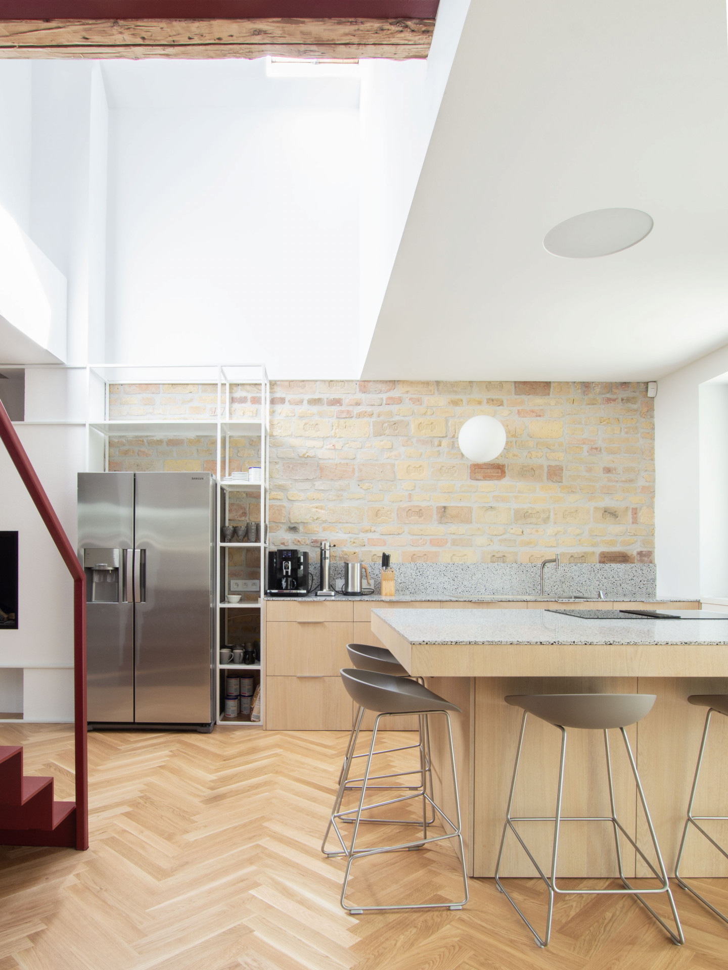 Jednoznačným srdcem dvoupodlažního interiéru se stala kuchyně propojená s galerií v patře, ze které se vstupuje do jednotlivých pokojů. Nejvýraznější prvek nového interiéru představuje vložené ocelové schodiště zdůrazněné červeným nátěrem. Celý obytný prostor je uspořádán okolo schodiště a kuchyně, kde se otevírá do galerie. Kuchyň se tak stává bodem, který spojuje jednotlivé prostory v horizontálním i vertikálním směru.