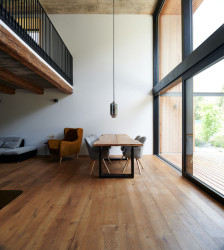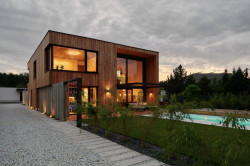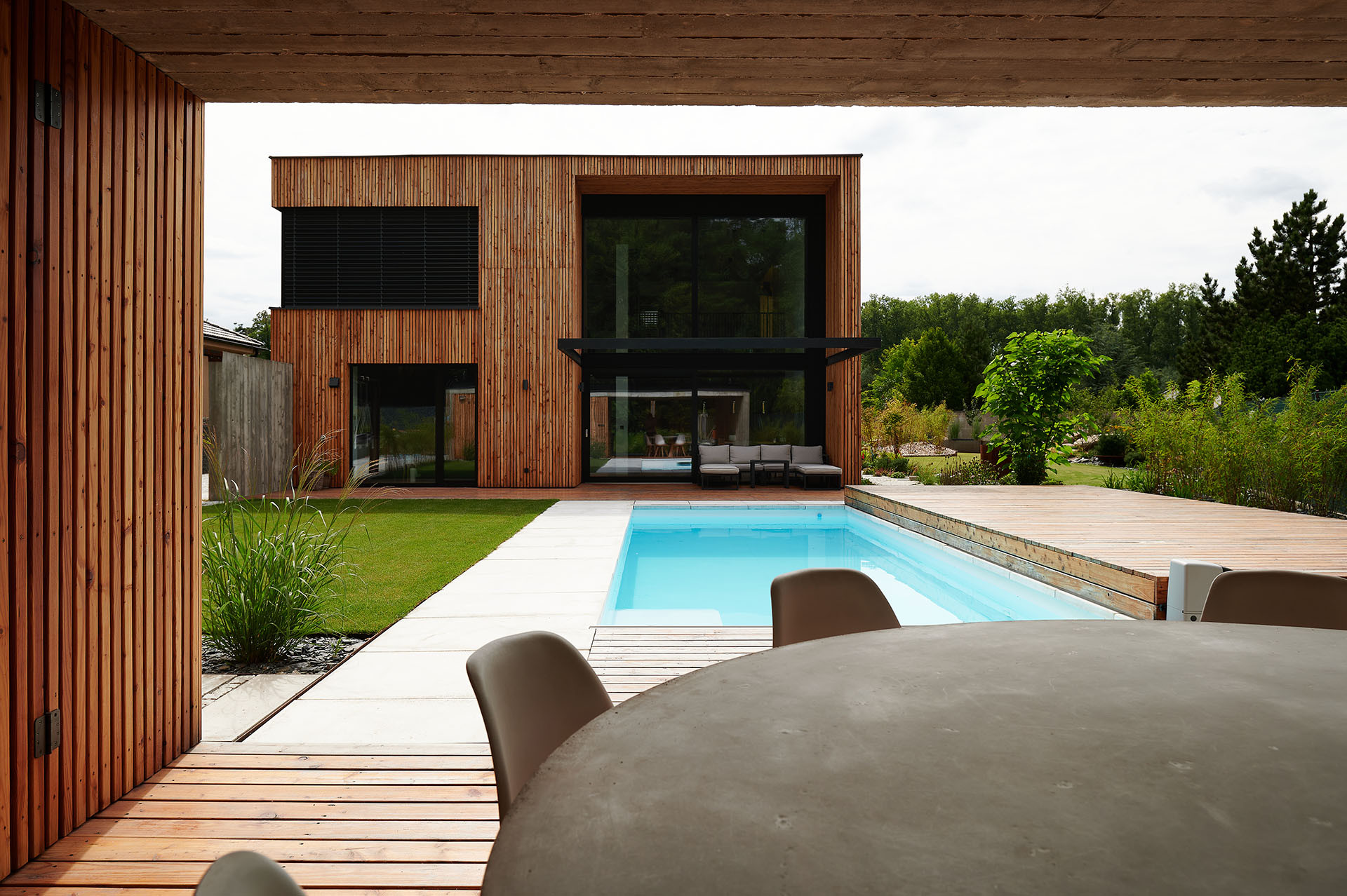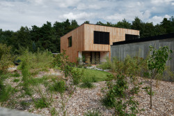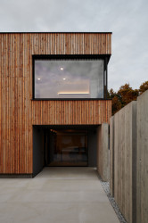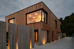Dům kombinuje pohledový beton a dřevěný obklad. Zatímco beton zajišťuje pevnost a definici prostoru, dřevo přináší teplo a schopnost přizpůsobit se času. Časem šednoucí dřevěná fasáda a zarůstající zahrady slibují, že dům bude s okolní přírodou stále více splývat.