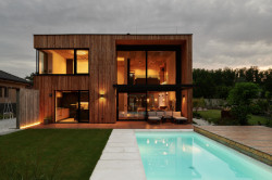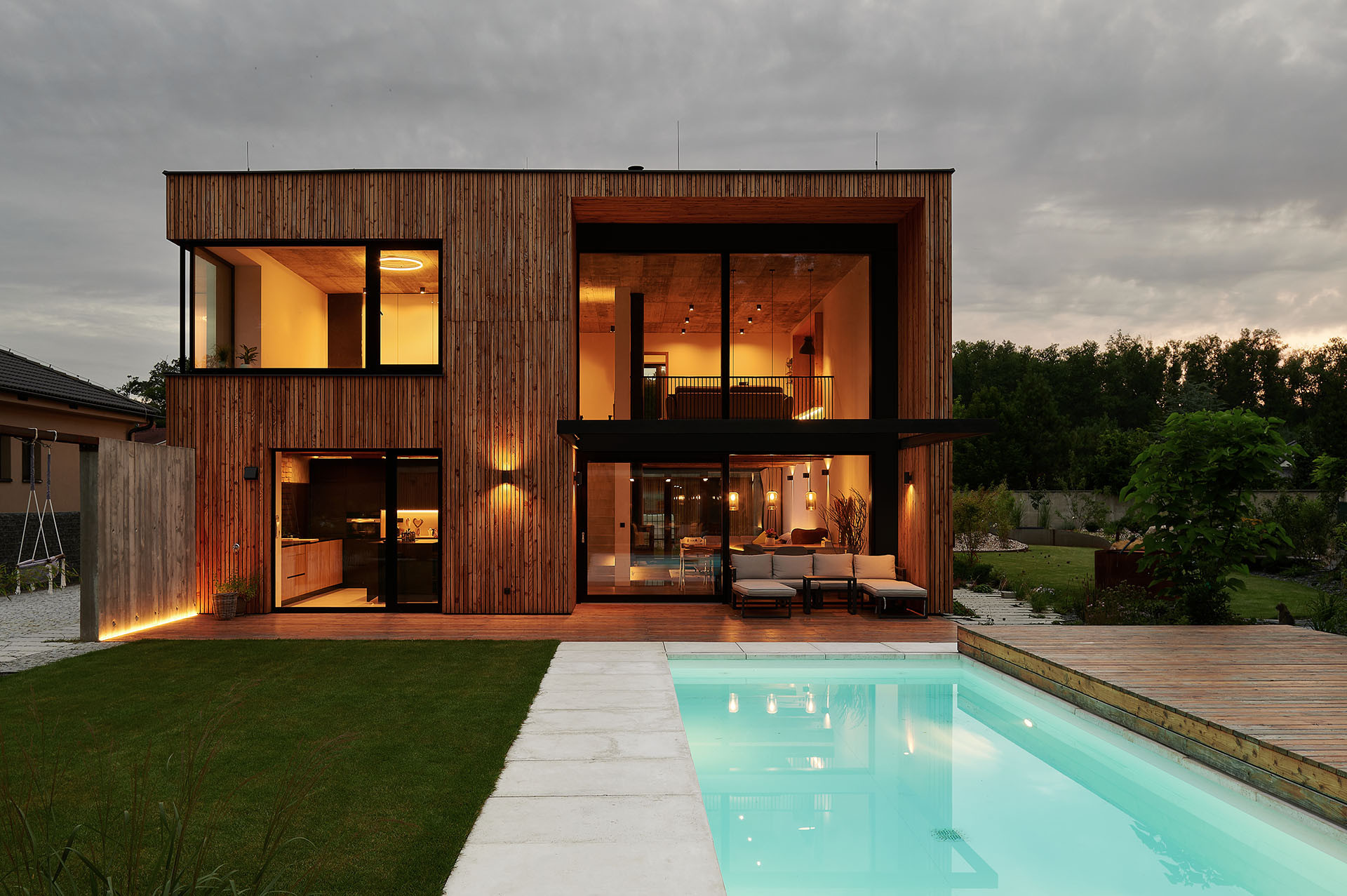 Současný dům pro čtyřčlennou rodinu staví na jednoduchém principu – být pohromadě. Centrum rodinného života je ve velkém obytném přízemí, kde je kuchyně, obývací pokoj a jídelna, převýšená do patra. V patře jsou pak dva dětské pokoje a ložnice. Tím to ale nekončí, důležitá je zahrada, která je rozšířením domu.