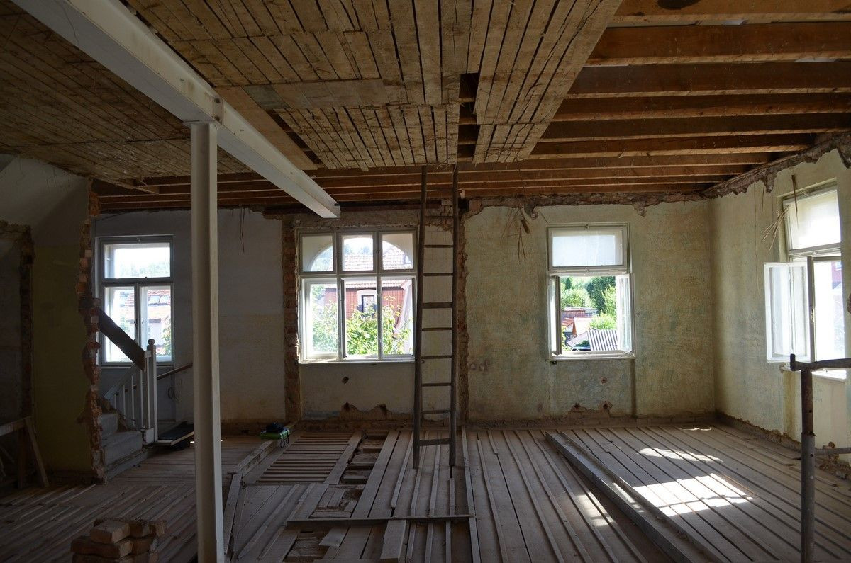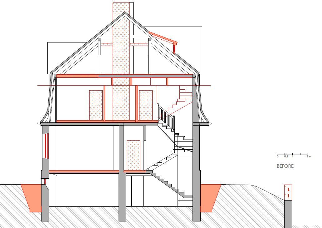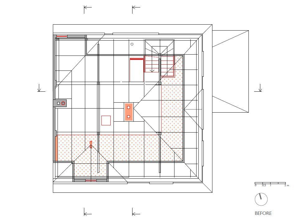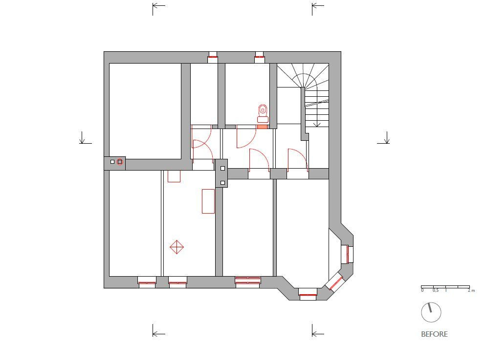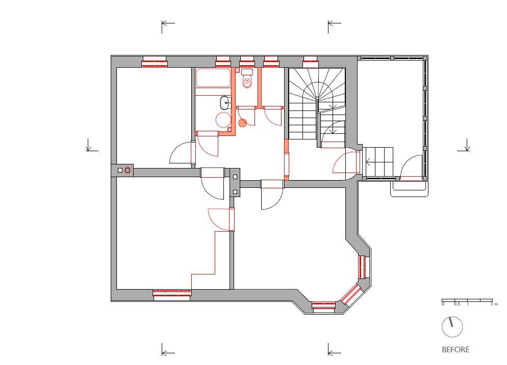 Přízemí se téměř nezměnilo, všechny zdi byly nosné, a tudíž se s nimi nehýbalo. Dveře zůstaly původní a schodiště do suterénu i prvního patra se pouze zrenovovalo. U schodiště do třetího patra to už ale bohužel možné nebylo, a tak se přistoupilo k jeho výměně - umístění však zůstalo stejné. V patře byly všechny stěny – částečně nosné příčky – odstraněny a celý prostor se otevřel pro obývací pokoj, který se probouráním do půdních prostor rozšířil i vertikálně. Těžko využitelné plochy pod šikmou střechou se staly součástí obývacího prostoru a dodaly mu patřičný význam. Do dříve nevyužívaného podkroví se po přestavbě vybudoval pokoj pro hosty a otevřená pracovna.
