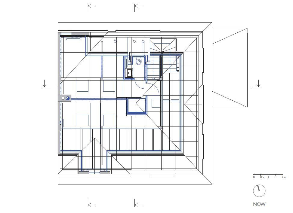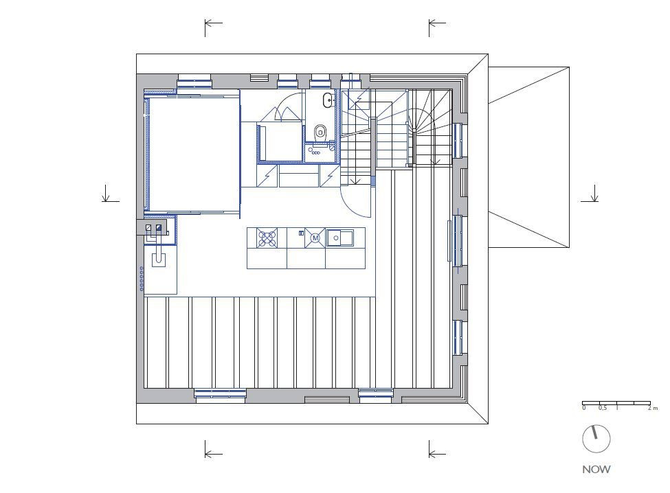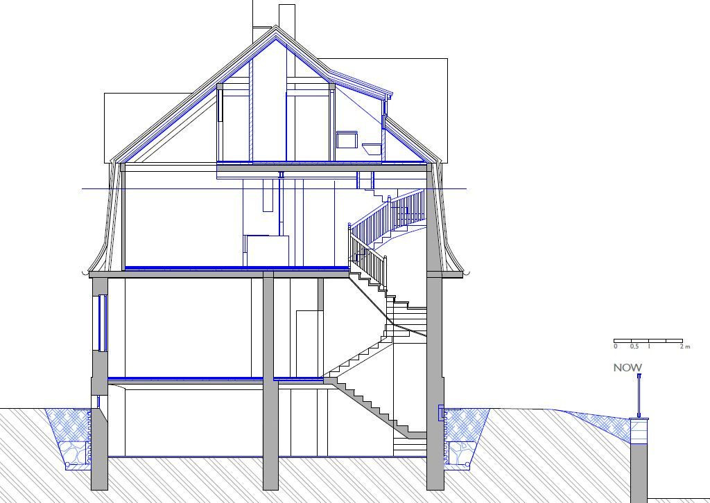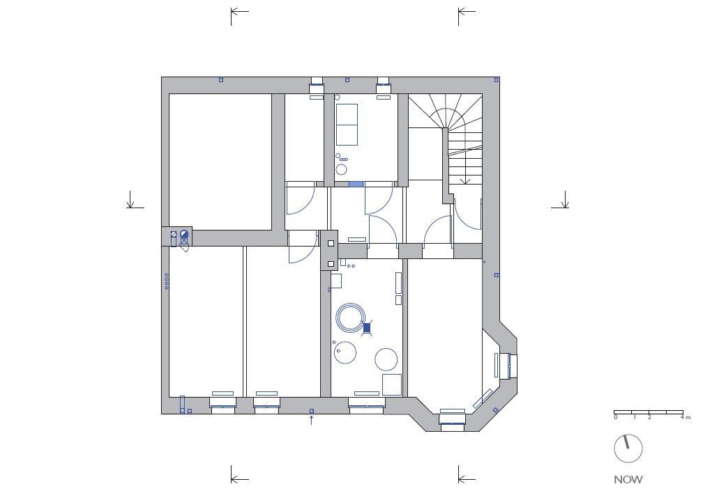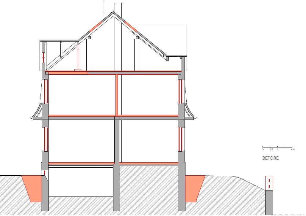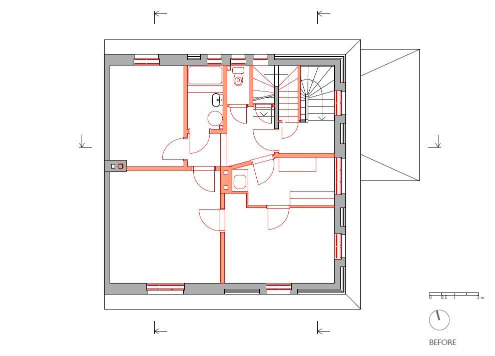 Přízemí se téměř nezměnilo, všechny zdi byly nosné, a tudíž se s nimi nehýbalo. Dveře zůstaly původní a schodiště do suterénu i prvního patra se pouze zrenovovalo. U schodiště do třetího patra to už ale bohužel možné nebylo, a tak se přistoupilo k jeho výměně - umístění však zůstalo stejné. V patře byly všechny stěny – částečně nosné příčky – odstraněny a celý prostor se otevřel pro obývací pokoj, který se probouráním do půdních prostor rozšířil i vertikálně. Těžko využitelné plochy pod šikmou střechou se staly součástí obývacího prostoru a dodaly mu patřičný význam. Do dříve nevyužívaného podkroví se po přestavbě vybudoval pokoj pro hosty a otevřená pracovna.