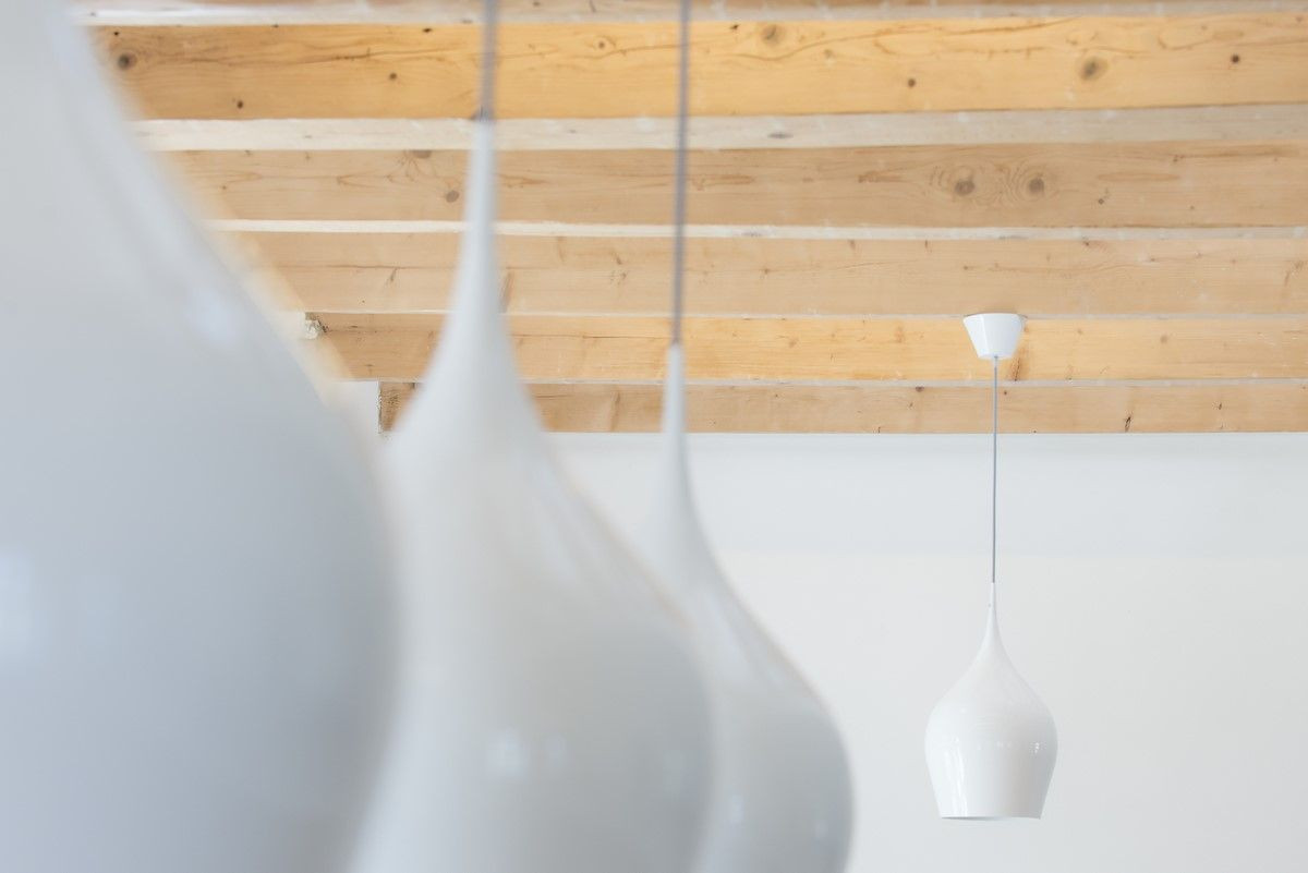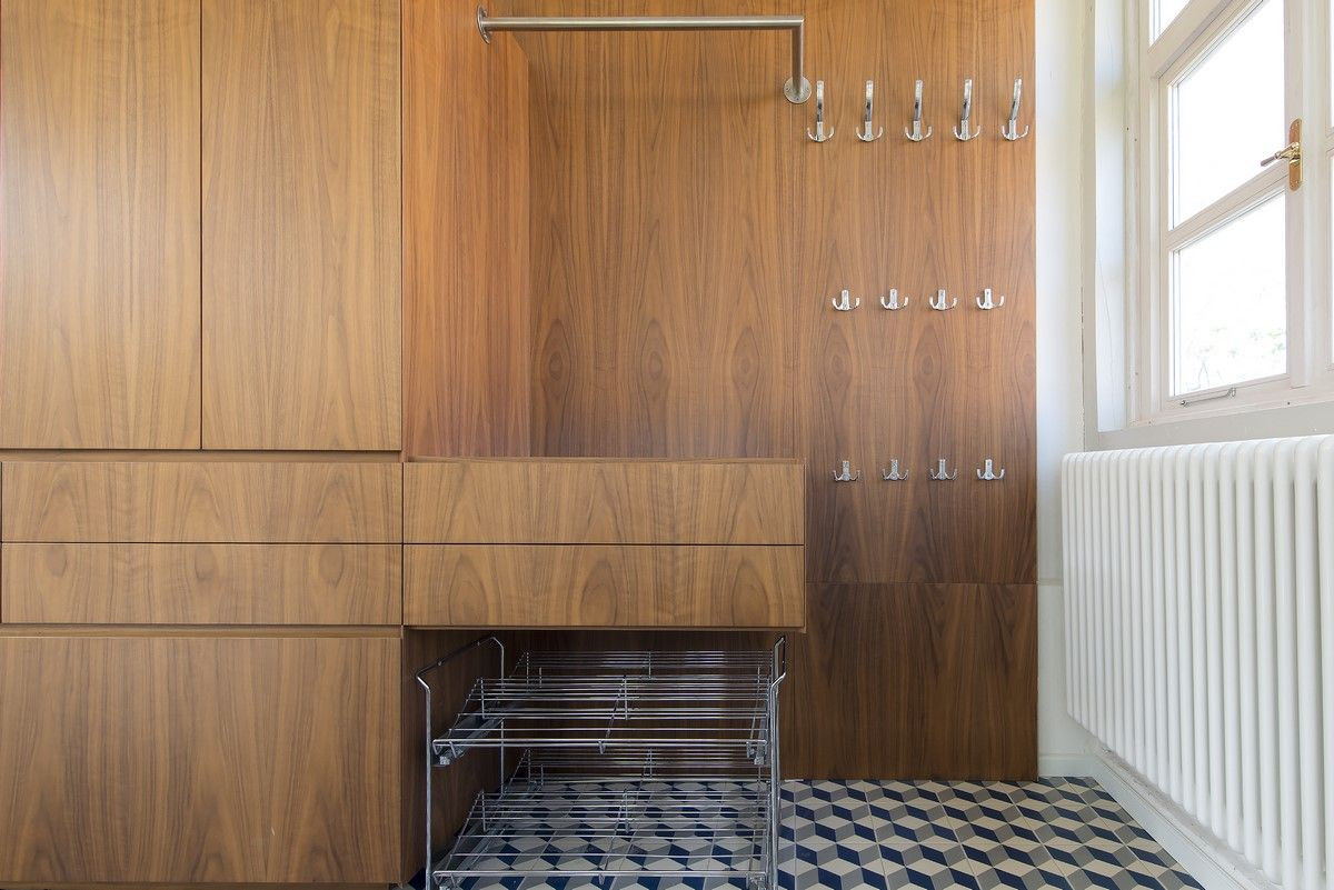 „Podlaha je dubová, nábytek je ořech. Kombinace světlého a tmavého dřeva byl jeden z požadavků klientů. Chtěli jsme, aby byl interiér světlý. Vzhledem k tomu, že je to starý dům s relativně malými špaletovými okny (v porovnání s novostavbami), rozhodli jsme se dát na podlahu radši světlý odstín.“ Pavlíček zároveň dodává, že chtěli trámy z podkroví natřít na bílo, „když jsme ale viděli, jak jsou zachovalé, nechali jsme je jen obrousit a napustit olejem.“