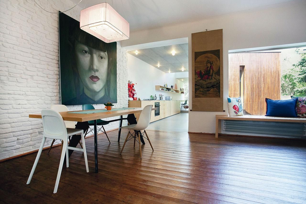 Ak spomíname, že je interiér pôvodného domu plný uchopiteľnej minulosti, tak interiér prístavby mu robí plnohodnotného sparring partnera. VSA v stávajúcom dome zachovali pôvodné dubové podlahy, kompletne oprali tehly jednej steny obytného priestoru, zrepasovali pôvodné krídla dverí a osadili ich do nových bielych zárubní, zachované zariaďovacie predmety a nábytky skombinovali so súčasnými. Pavilón prístavby so svojimi prírodnými povrchmi pôvodný dom dopĺňa – priznaný betónový strop a liata podlaha, biele omietky a vložený vstavaný nábytok, obdobne premiešané niekdajšie interiérové prvky s tými súčasnými. Výsledné dielo je zrkadlom životného štýlu naprieč generáciami, vzťahu k hodnotovým preferenciám a citlivosti v narábaní s nimi.