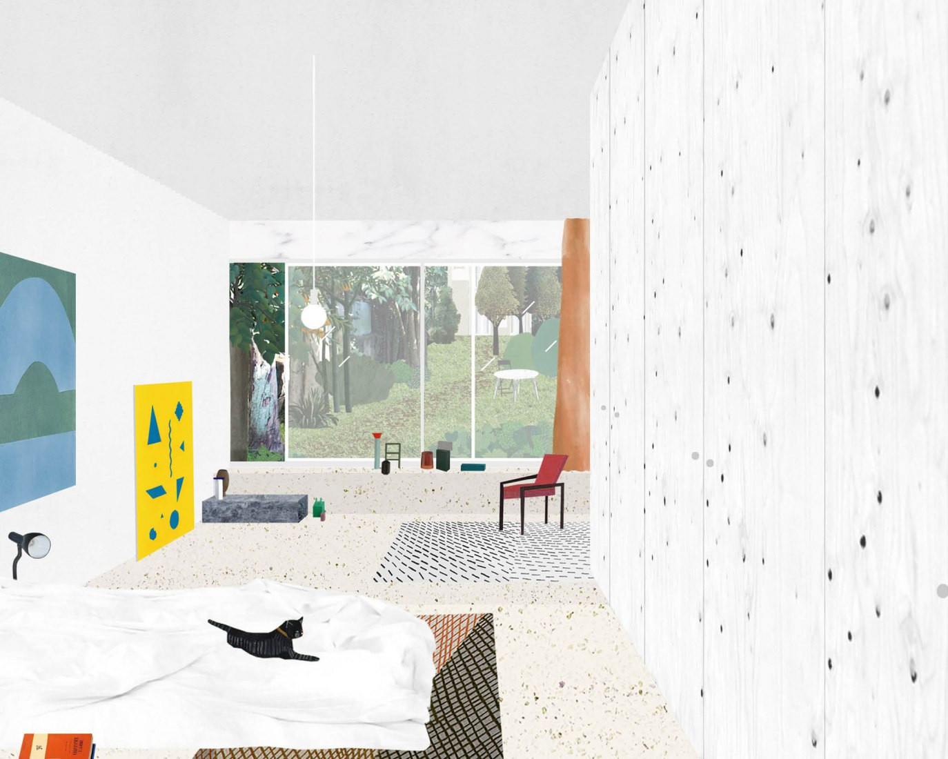 „Koupelna a úložný prostor jsou skryty za jednolitou skříní z lakovaného dřeva, jejíž měřítko se záměrně nachází někde mezi architekturou a nábytkem. Palác by přece jen neměl být příliš jednoduchý,“ říkají s mírnou nadsázkou architekti.