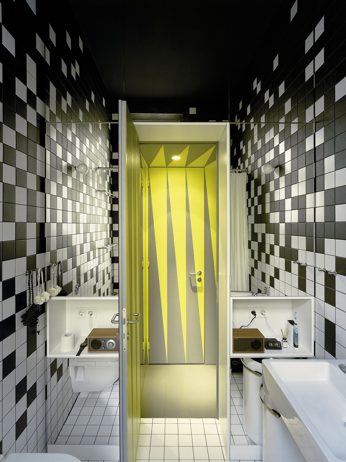 Architekti si také vyhráli s mozaikou, ať už s čtvercovou černobílou, nebo odvážnou a nevídanou trojúhelníkovou kombinací světle zelené a šedé.