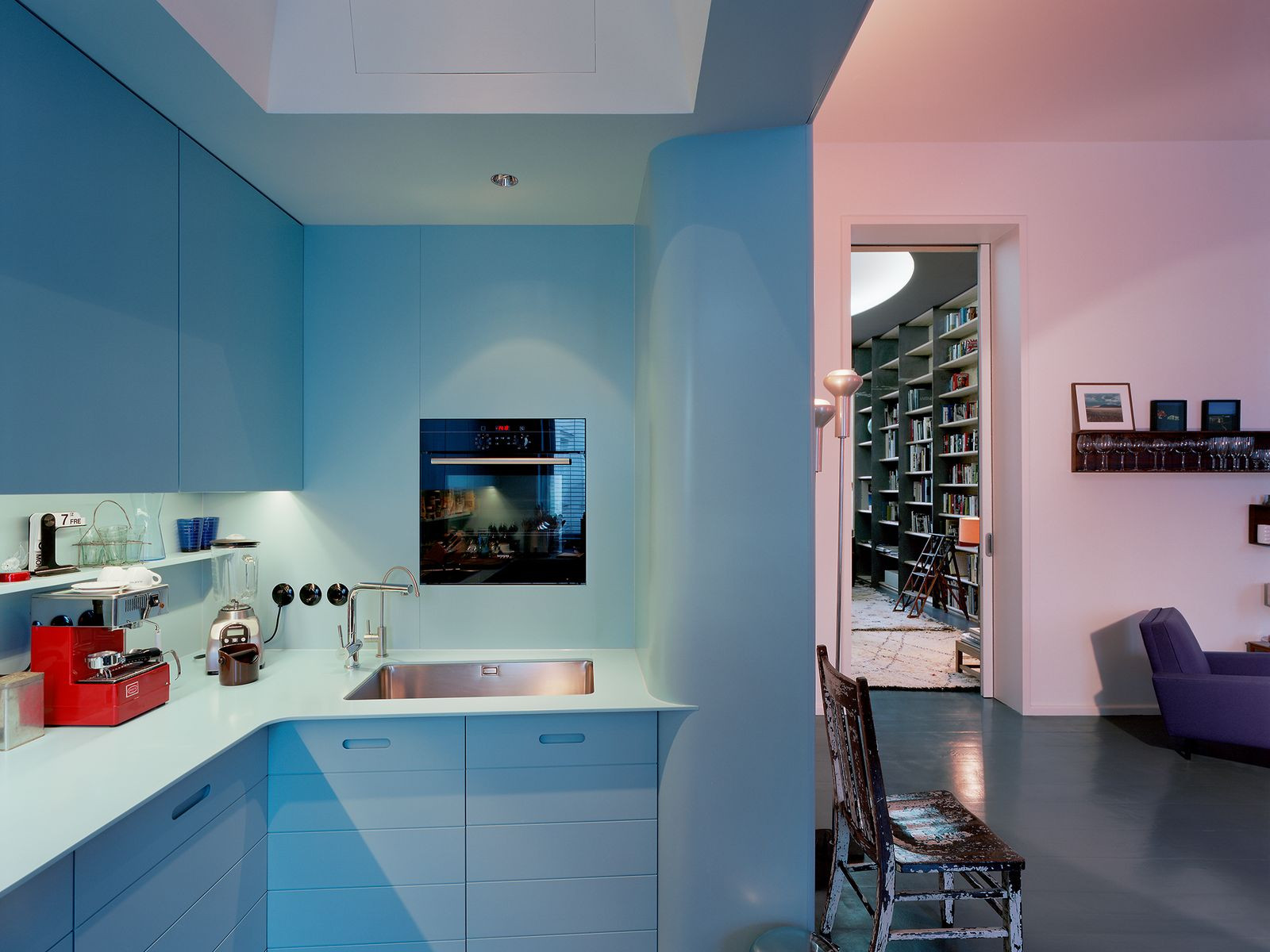 Ve vedlejší kuchyni rozhodně teplo majiteli nebude. Modrá barva je studená, což je při rozžhavené troubě a rozpálené plotýnce k nezaplacení.