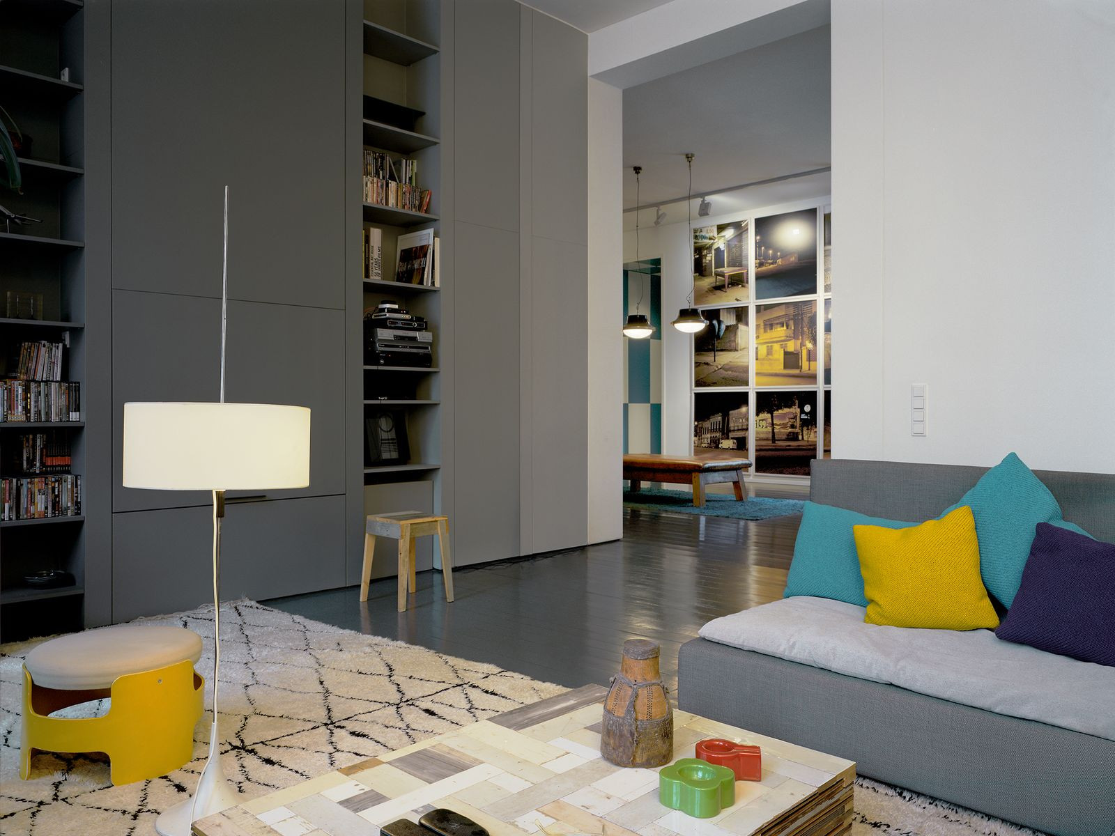 Šedá knihovna si rozhodně nebere za cíl rušit pozornost při čtení. Strohá a neutrální barevnost podtrhává klidnou atmosféru. Nepřímé osvětlení, zajištěné led páskou za „římsou“, zaručuje rovnoměrné osvětlení celé místnosti rozptýleným světlem.