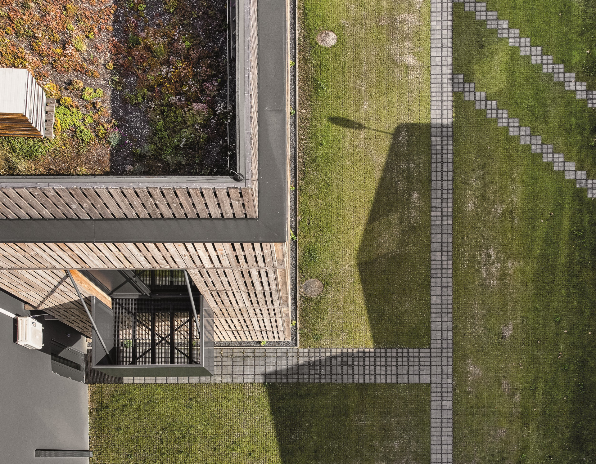 Principy udržitelné výstavby se propsaly také v blízkém okolí stavby. Zejména v práci se zelení. Původně byl na místě beton, dnes tady roste tráva. A to konkrétně skrz zatravňovací dlažbu, na které se dá také parkovat, současně ale umí zasakovat vodu. Totéž platí pro střechu budovy, která je vegetační.