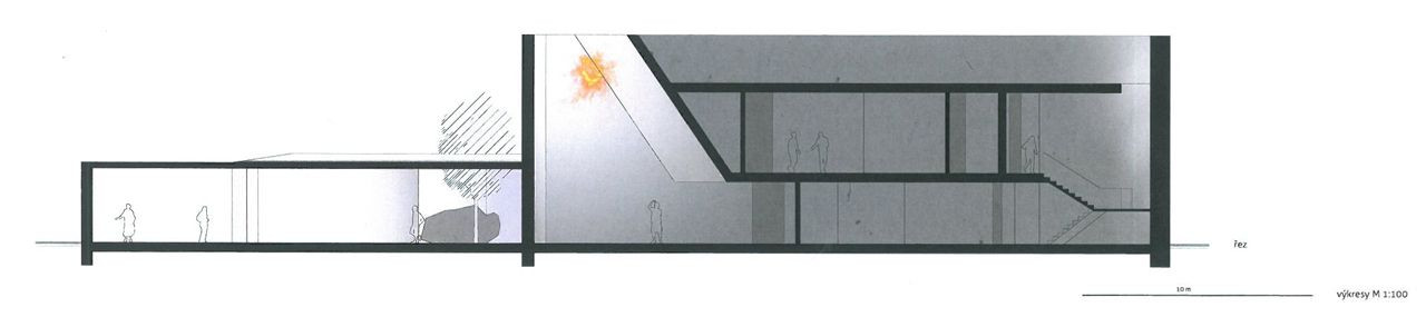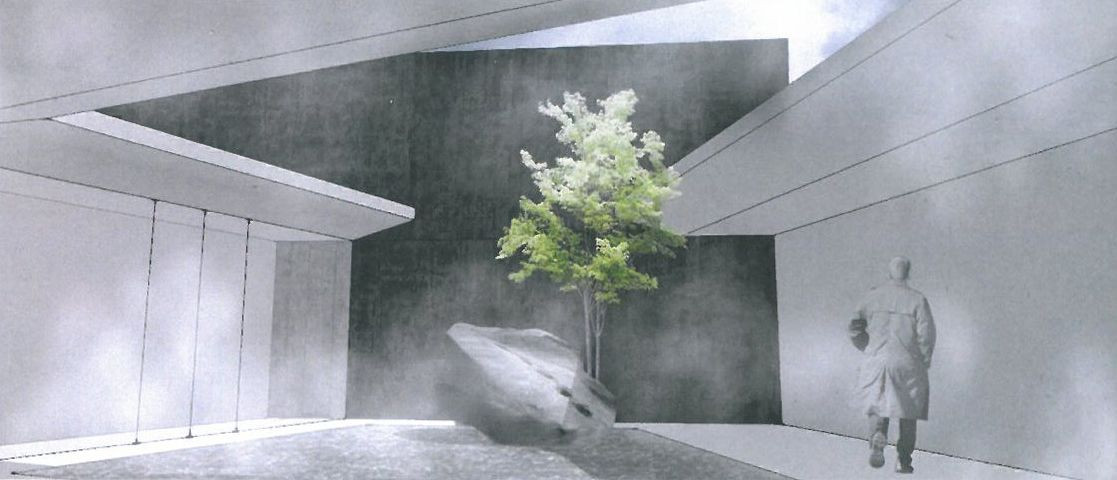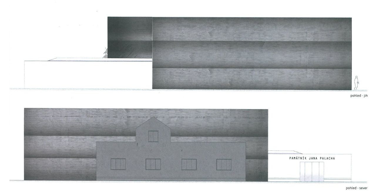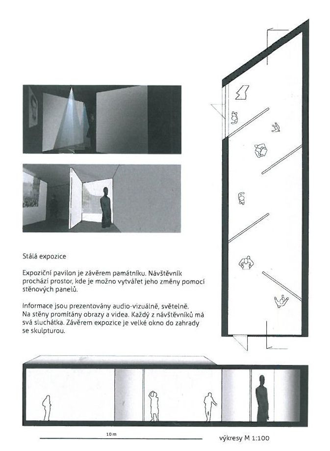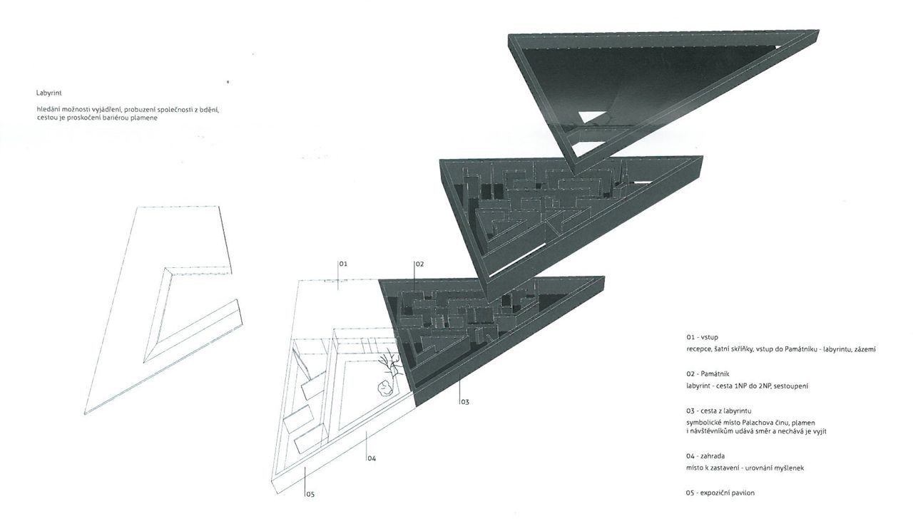 Návrh jednoznačně naplňuje zadání ve smyslu výrazného připomenutí a reflexe Palachova odkazu. Památník je koncipován jako labyrint znázorňující Palachovu cestu k činu sebeupálení. Jeho základní myšlenkou je vytvoření jakéhosi symbolického monumentálního kenotafu, jehož součástí bude pouze vnější slupka někdejšího rodinného domu obtisknutá ve vnějším plášti monumentálního trojúhelníku nové budovy Památníku situované logicky v cípu parcely. Veškerý emoční náboj expozice je koncentrován do několikapodlažního labyrintu s promyšleným scénickým osvětlením evokujícím cestu ke světlu jako cestu k uvědomění a poznání.