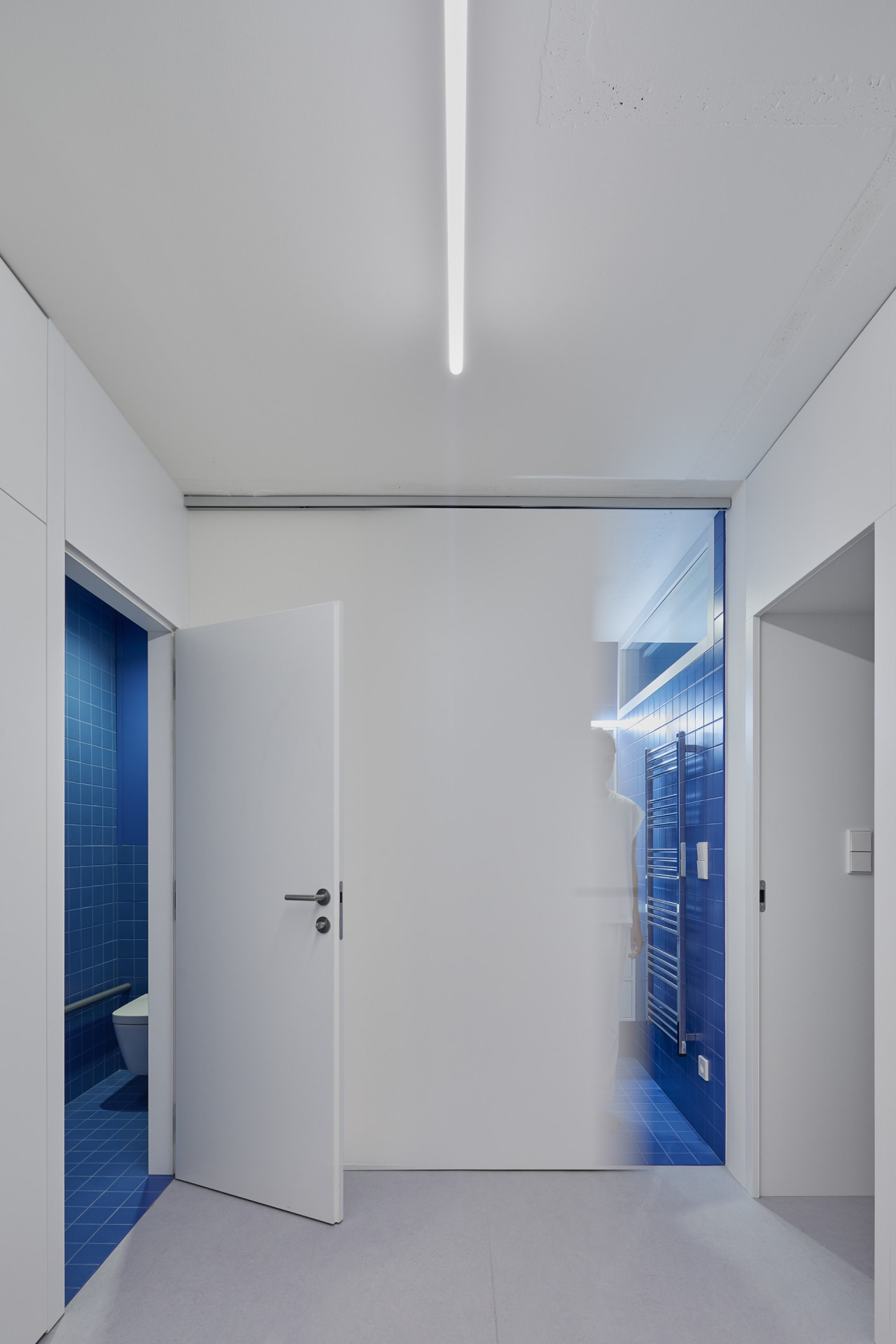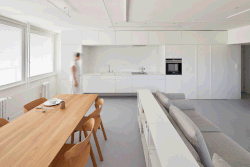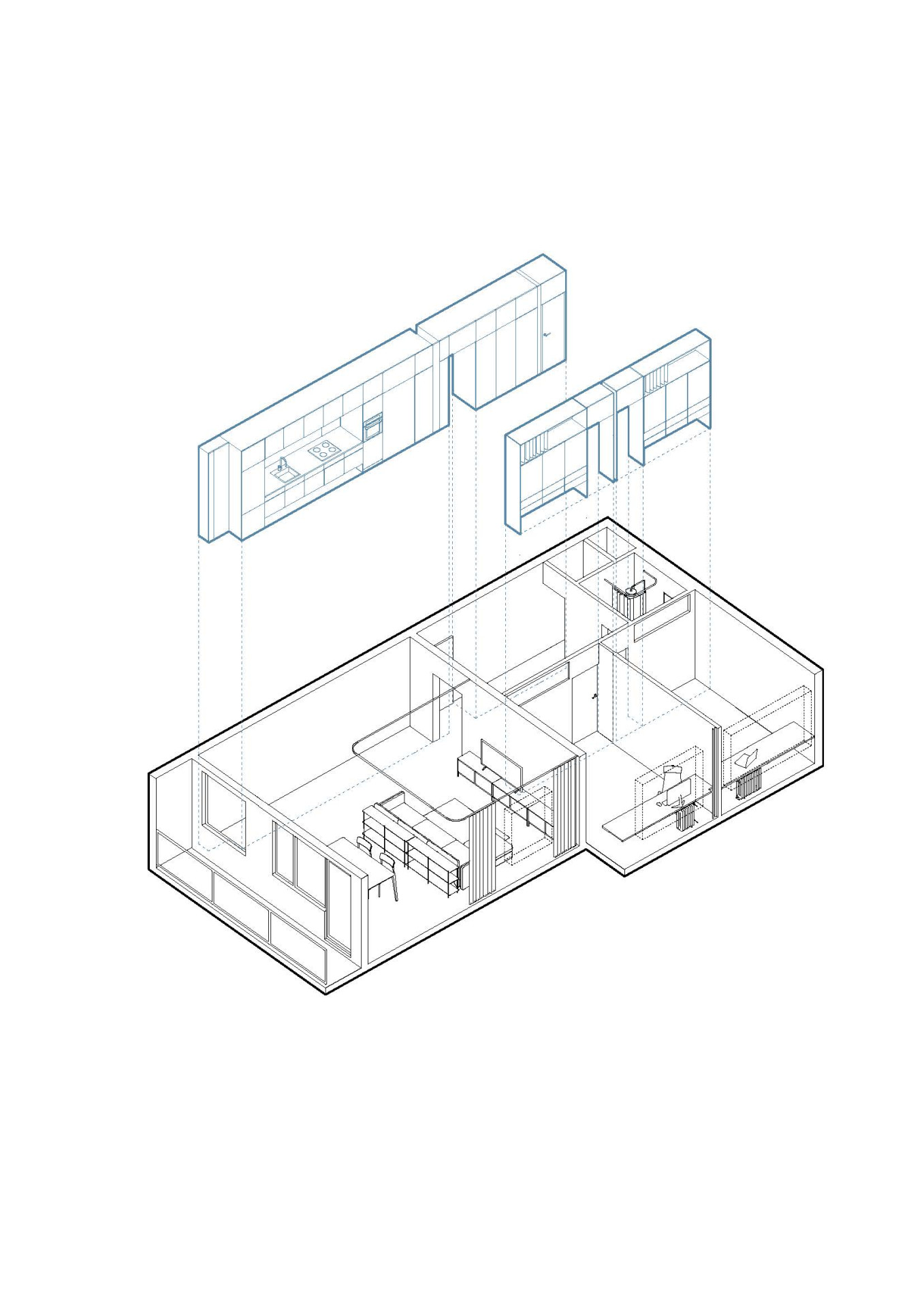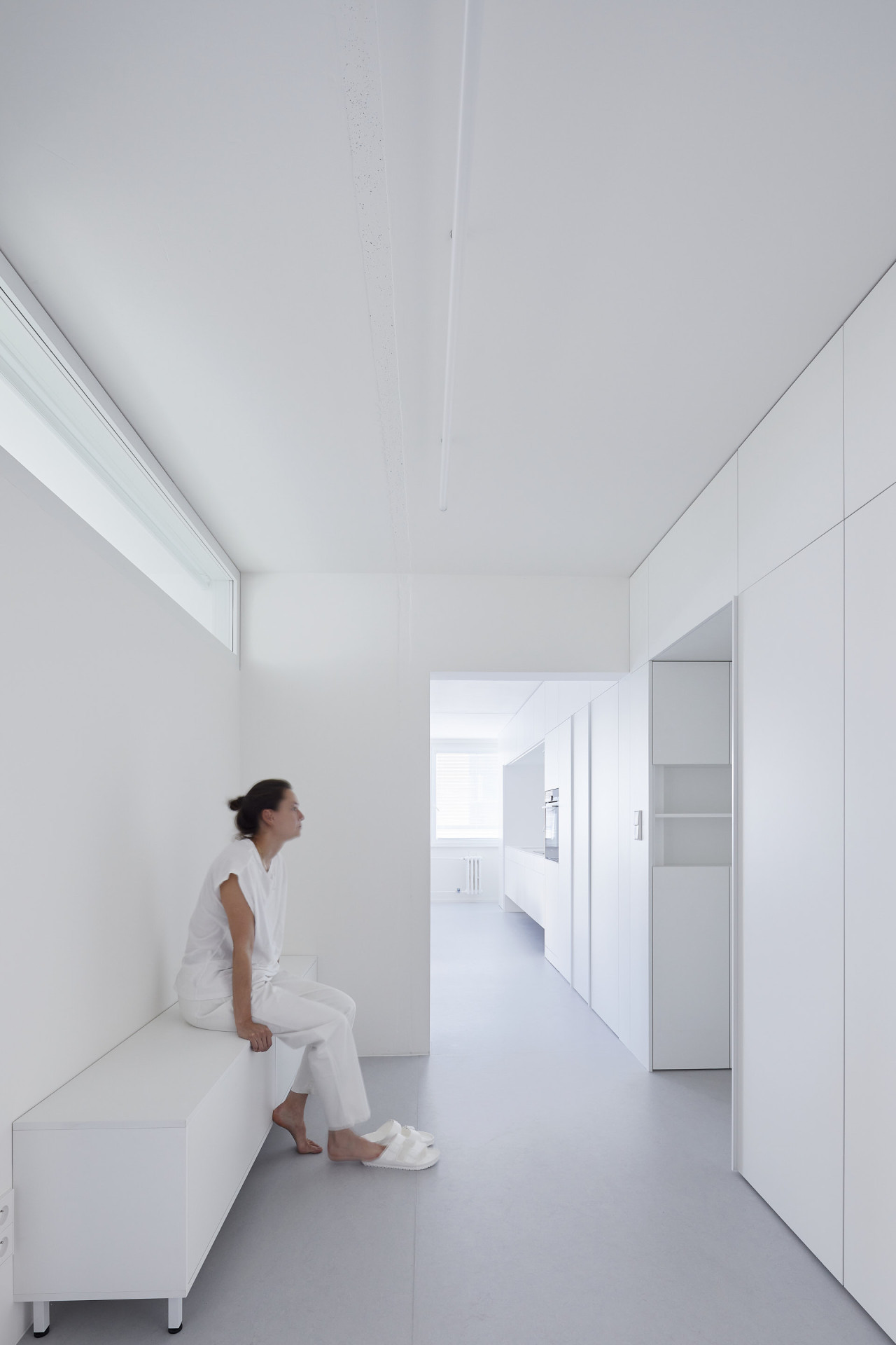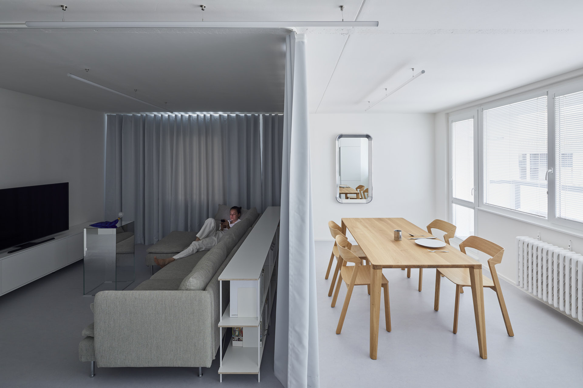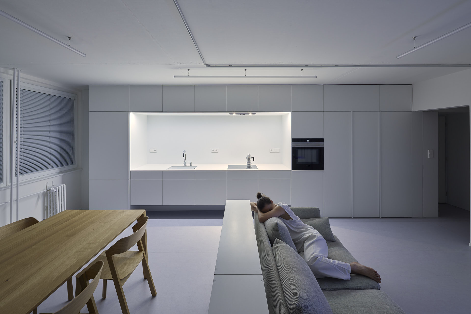 Přes celý byt, od podlahy až po strop, běží jednotná lineární sestava bílého utilitárního nábytku. Integruje v sobě kuchyni, mnoho skladovacího prostoru, prostor pro pračku a sušičku i samostatnou toaletu.