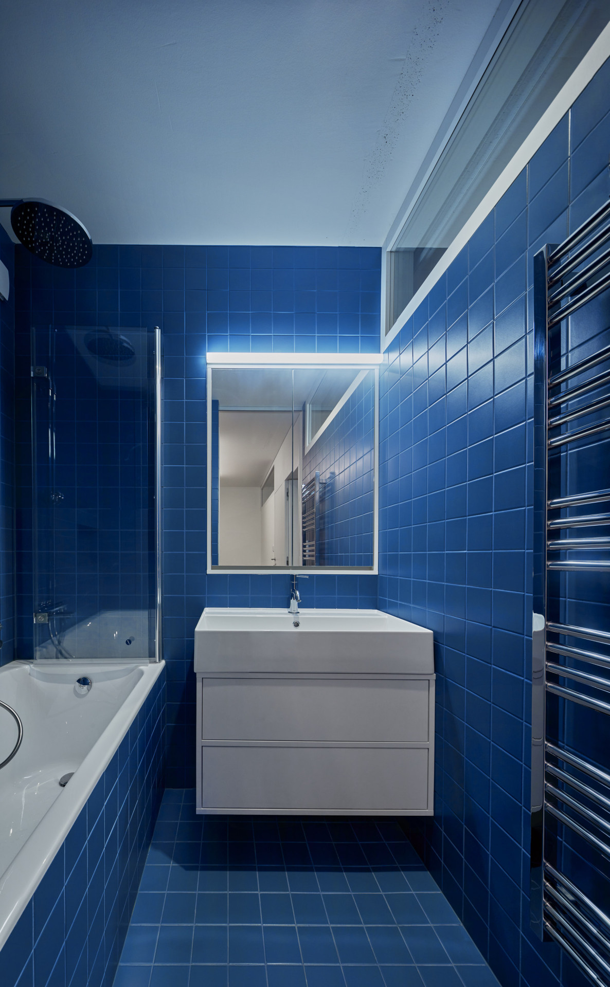 Dřevo, které je příjemné na dotek, je použito na jídelním stole a pracovních stolech v pokojích chlapců. V bytě ovšem hraje důležitou roli i modrá barva. Tu má paní H ráda. Je všude a současně nikde. Je skrytá a objeví se vždy, když se cokoli otevře. Je uvnitř každé skříně, kuchyňské skříňky, WC nebo v koupelně. Modrá je ornament, který se rozvíjí různorodostí vybavení, které uvnitř nábytku rodina uskladní.