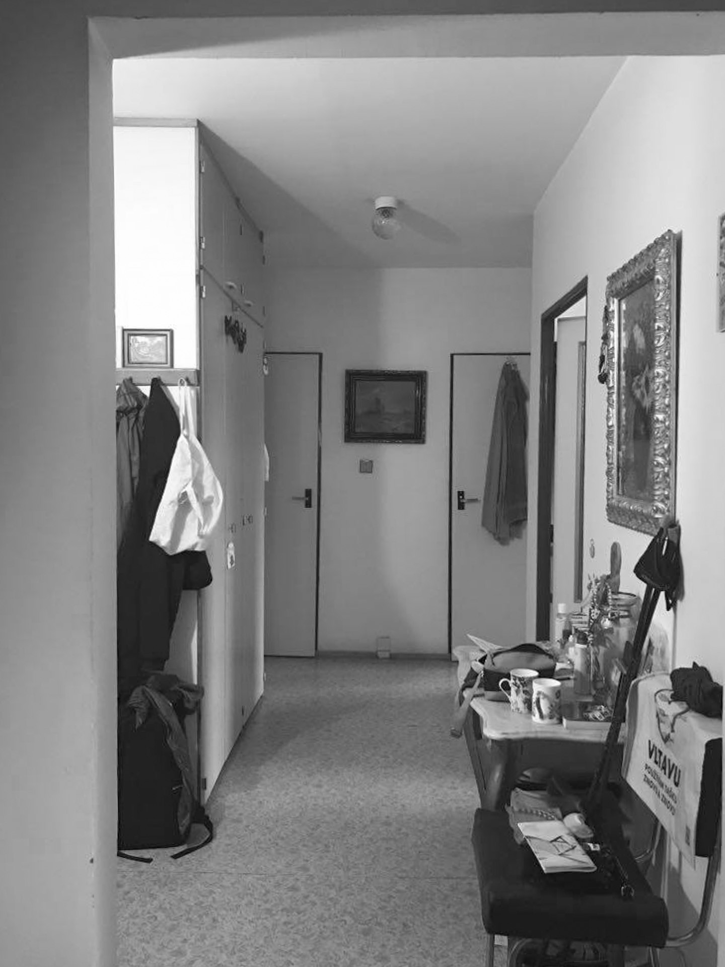 Druhá vrstva ornamentu je méně nápadná, ale dá se najít. Jsou jím styky panelů a ošetřené „jizvy“ po odstranění příček. Podobně jako původní stále dobře fungující článkové radiátory nebo trubkové rozvody vytápění, společně představují paměť a charakter původního panelového bytu. Tyto momenty a prvky se nesnažíme skrýt, jakoby byly něco nehezkého. Panelový byt se za ně nemá proč stydět. Jsou pro něj přirozené.