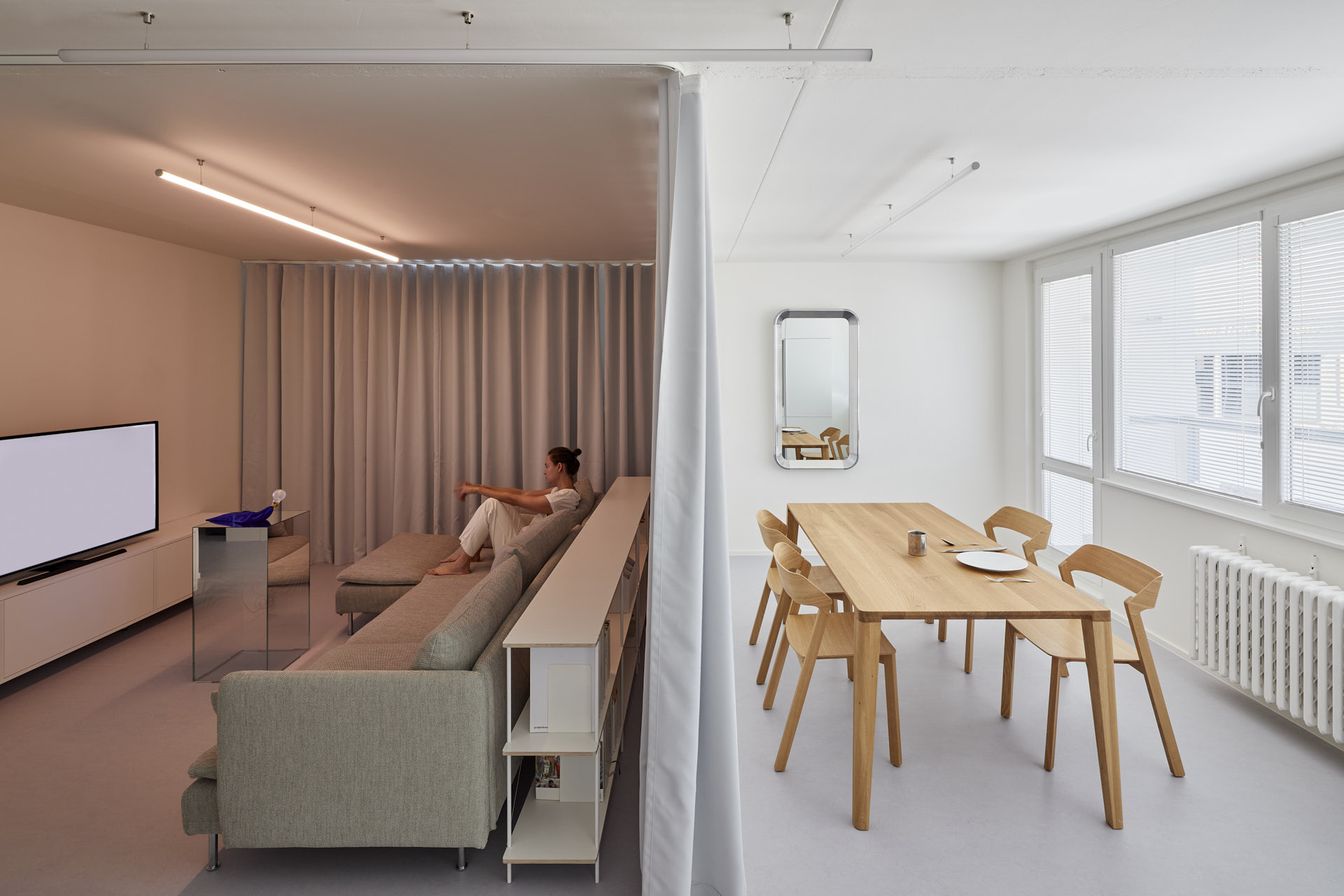 Situací a scénářů vzájemných kombinací je mnoho. Tyto dva světy za tenkou membránou jsou propojeny, nicméně při vzájemném respektu mohou fungovat dobře i autonomně. Když je závěs odsunut, je to klasický obývací pokoj s kuchyní a jídelnou, kde rodina funguje spolu. Závěs se tehdy stává nejen dekorací, ale zlepšuje i akustiku velké místnosti.