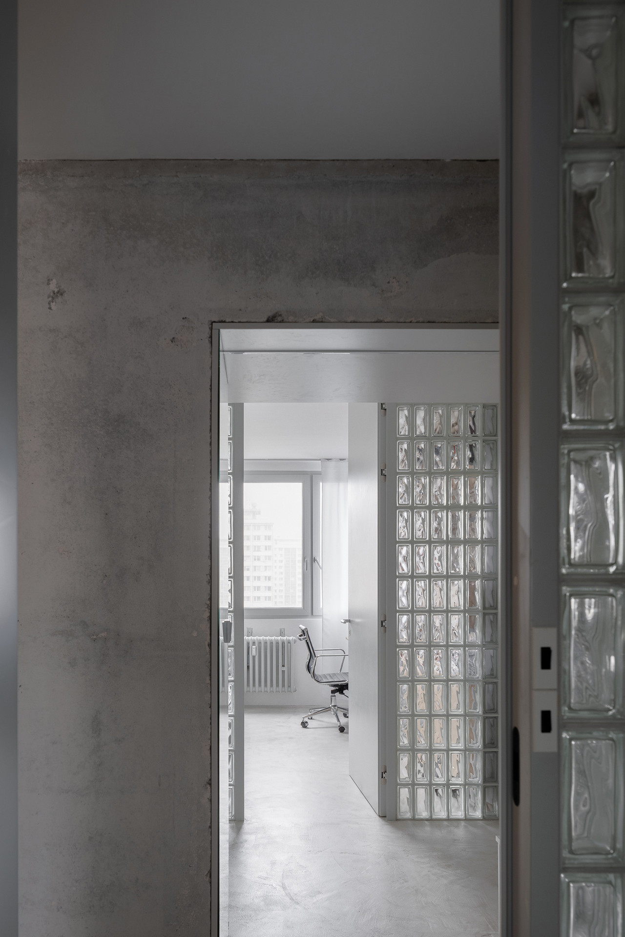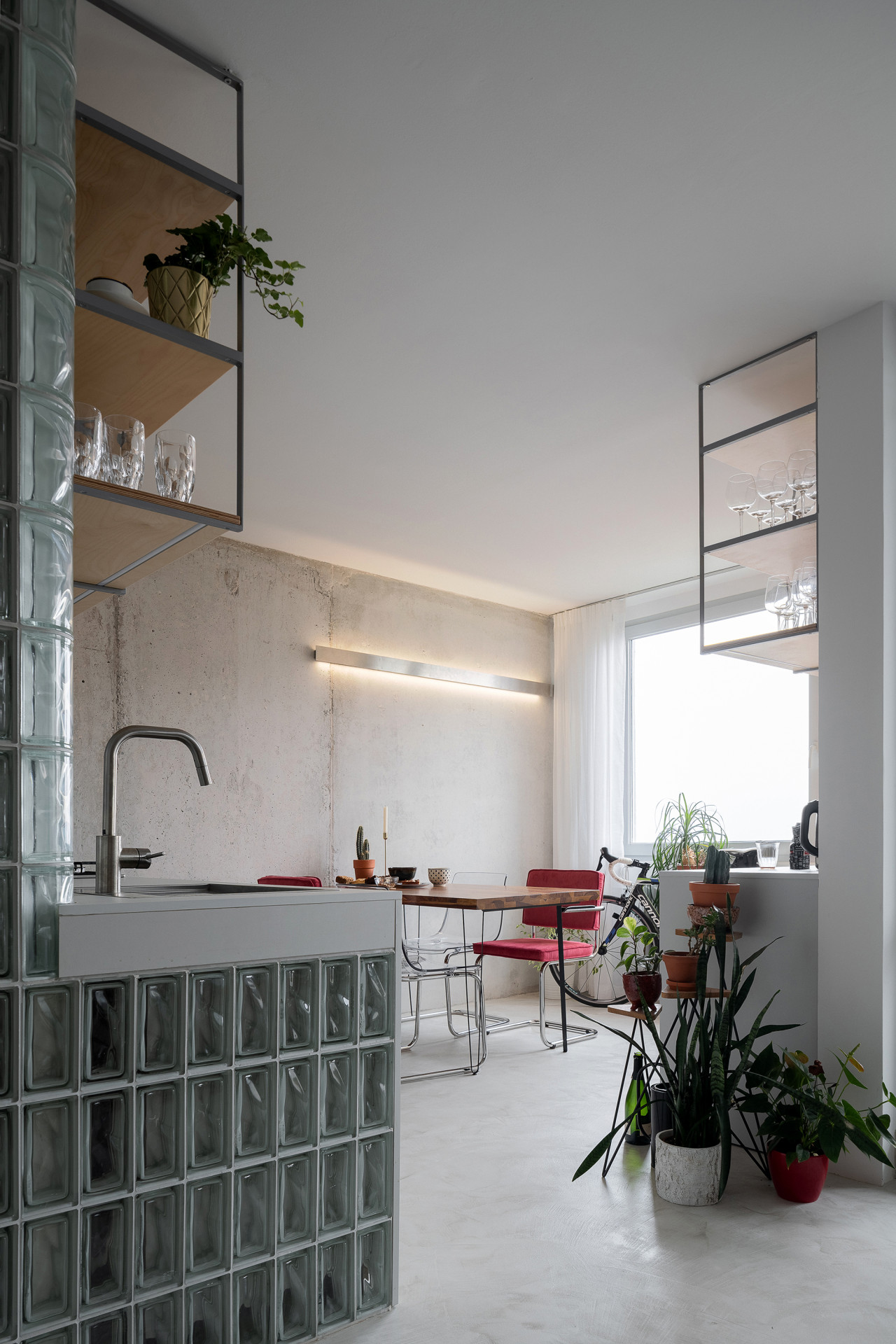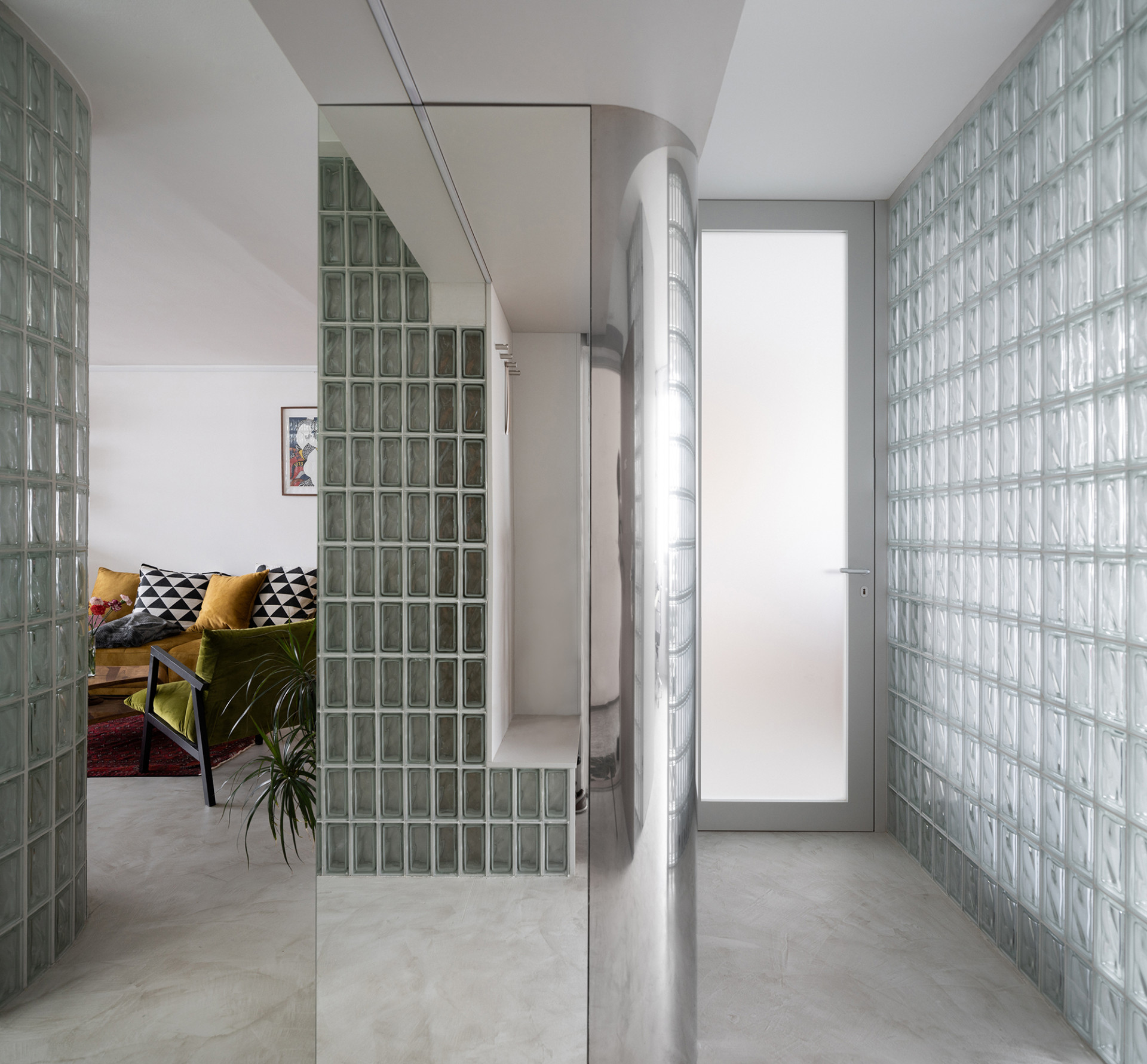 Nejdůležitějším bodem rekonstrukce bylo prosvětlení celé dispozice bytu. Proto architekti přišli s nápadem prosklených příček z luxfer, které mají dobré akustické vlastnosti, propouští světlo a lze je vyskládat i do oblouku. Luxfery se tak nakonec staly ústředním prvkem celého interiéru.