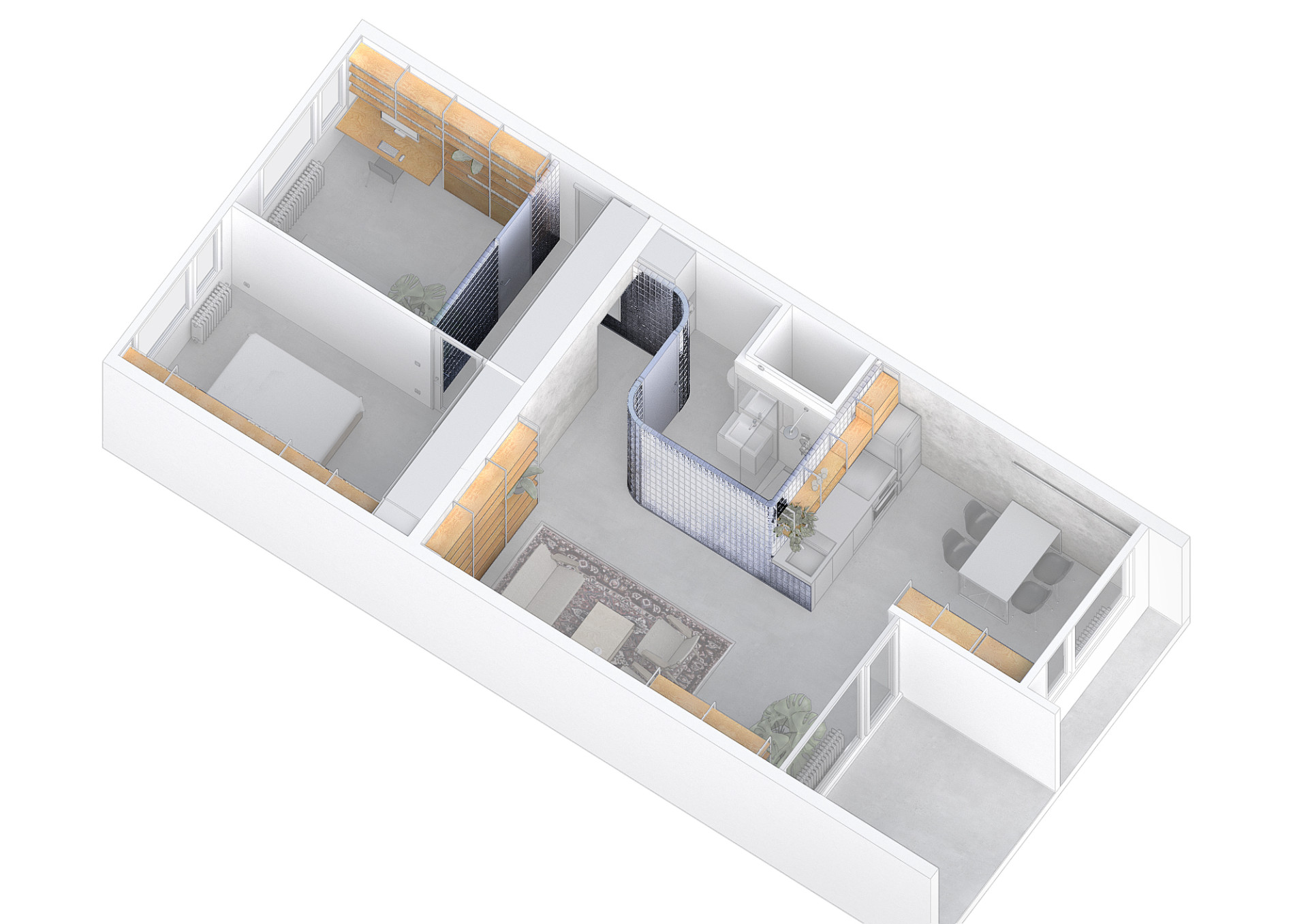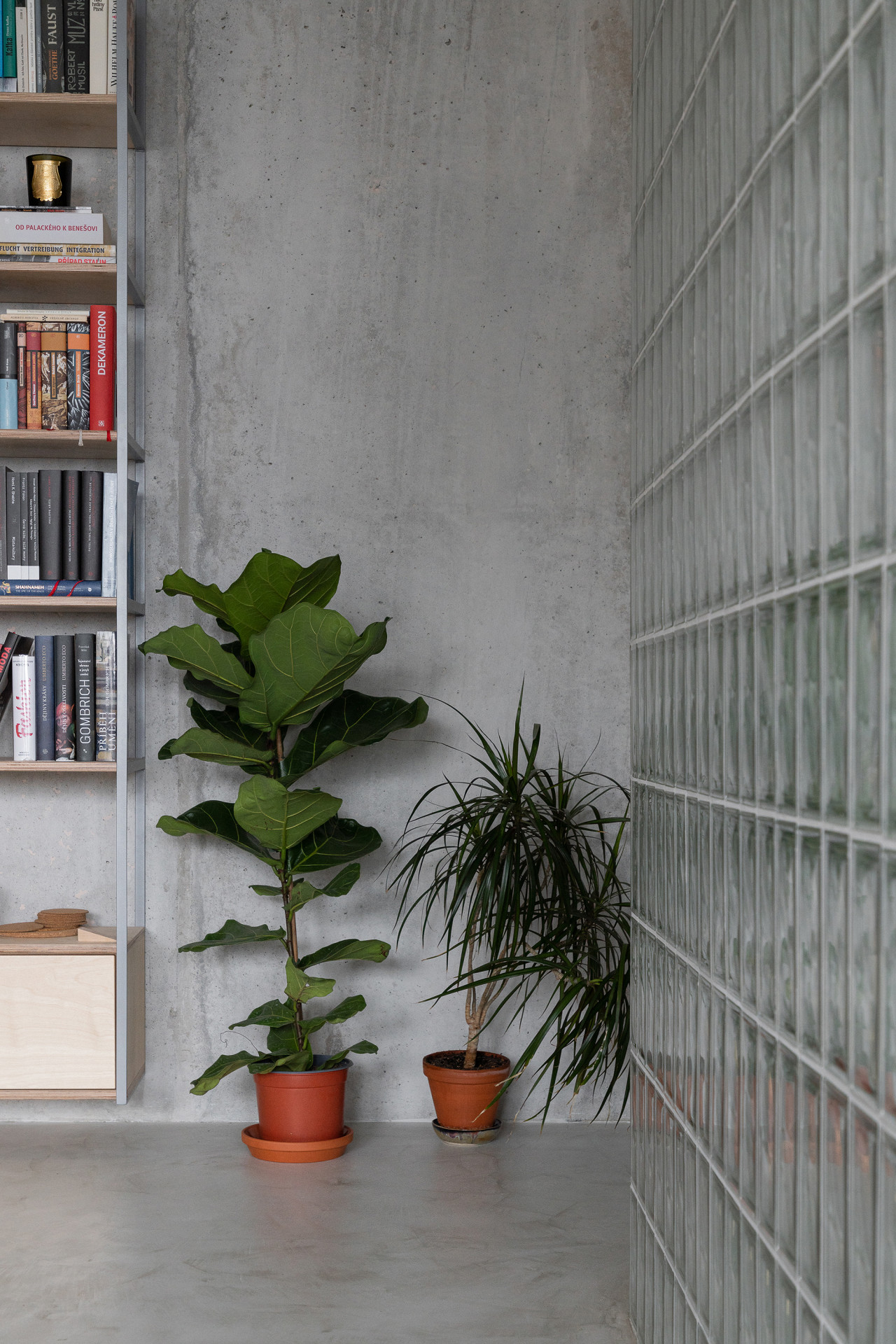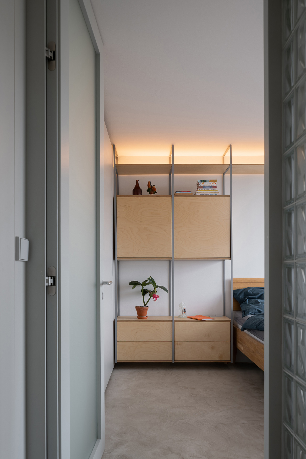 Studio Papundekl navrhlo na míru bytu také modulární regálový systém, který je pomocí ocelových rámů kotven ke stropům. Police z březové překližky svou texturou i barvou podstatně zjemňuje celý interiér, ve kterém jinak převažují šedivé povrchy podlah i odhalené betonové konstrukce. Regály jsou uzpůsobeny specifickým funkcím, takže slouží třeba jako knihovna, kuchyňské skříňky, pracovní stůl nebo noční skříňky. Systém polic chytře šetří místo a současně pěkně sceluje celý interiér.