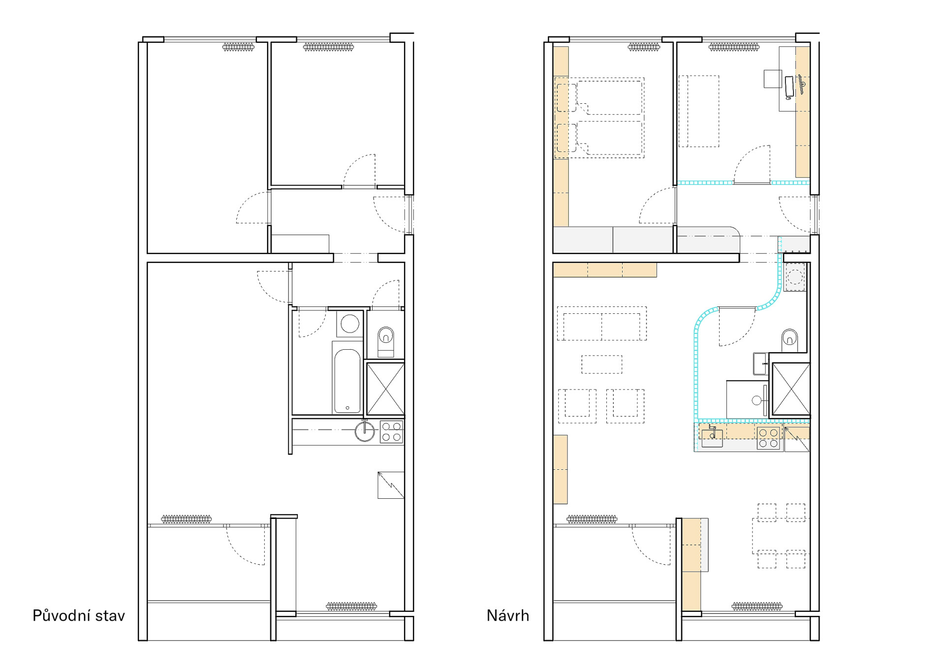 “Již během koupě bytu na námi oblíbeném sídliště Ďáblice jsme věděli, že chceme oslovit nějaké architektonické studio. Na doporučení známých jsme kontaktovali tým architektů, který se možností rekonstrukce panelákového bytu zdál upřímně zaujatý. Prostor bytu jsme důvěrně znali, protože jsme v identické dispozici žili několik let v nájmu o pár ulic dál.