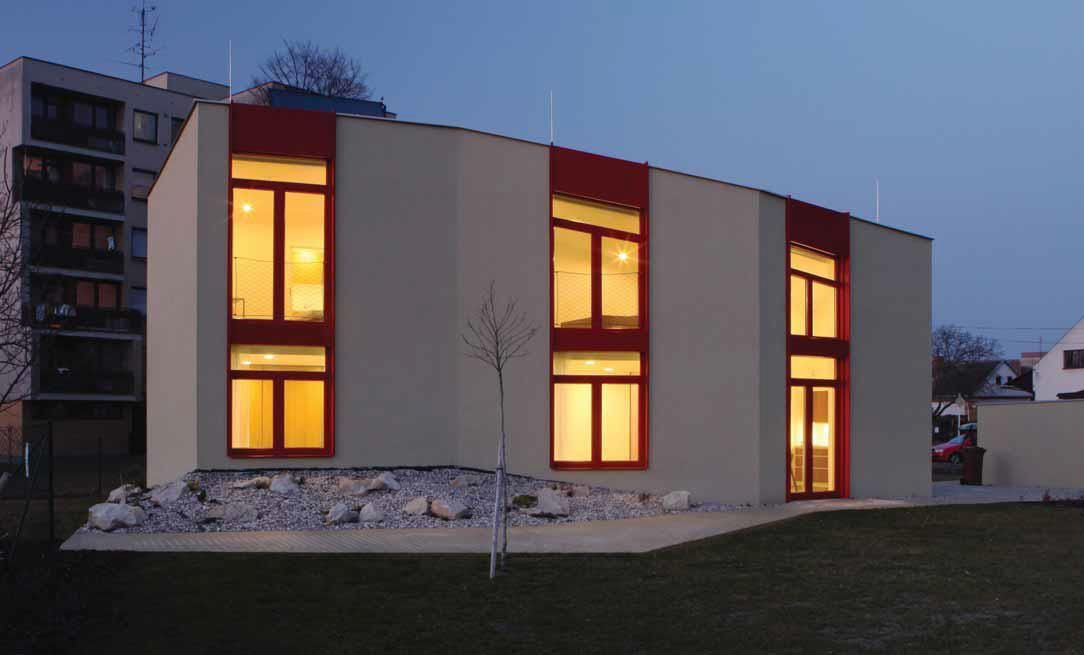 Dvakrát zalomená jižní fasáda dodává objektu v kombinaci s výškově proměnlivou atikou jistý prvek napětí a pohybu. Ten je navíc umocněn opakujícím se rytmem červených pruhů, vertikálně spojujících okenní nebo dveřní otvory. Hlavní obytné místnosti jsou přirozeně orientovány za sluncem. Z tohoto důvodu byl navržen venkovní systém předokenních žaluzií, který pomáhá eliminovat letní přehřívání při zachování optimální hladiny denního osvětlení. Jinak působí stavba kompaktně a téměř nedobytně,neboť okenních otvorů je na ostatních fasádách tohoto pasivního domu poskrovnu.