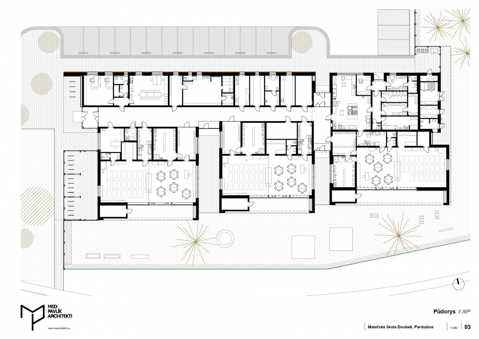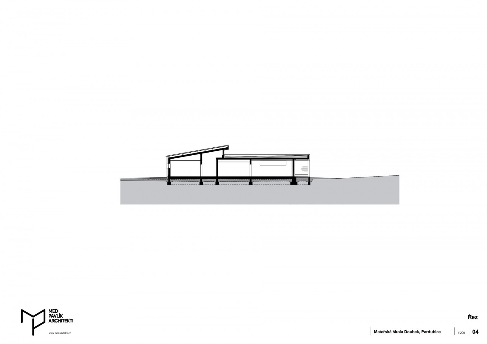 Herny Mateřské školy Doubek využívají tři skupiny předškolních dětí, které se společně mohou potkávat v centrální chodbě. Do té přichází denní světlo seshora, na jejím začátku je hlavní vstup, na který upozorňuje zešikmená střecha. Ta je stejně jako přední fasáda pokrytá falcovaným plechem. Architekti z kanceláře Med Pavlík architekti říkají, že před školkou chtěli vytvořit reprezentativní prostor. Místo schématu ulice-vstup navrhli středně velký plácek, na kterém se dá dobře potkávat i ve větší skupině.