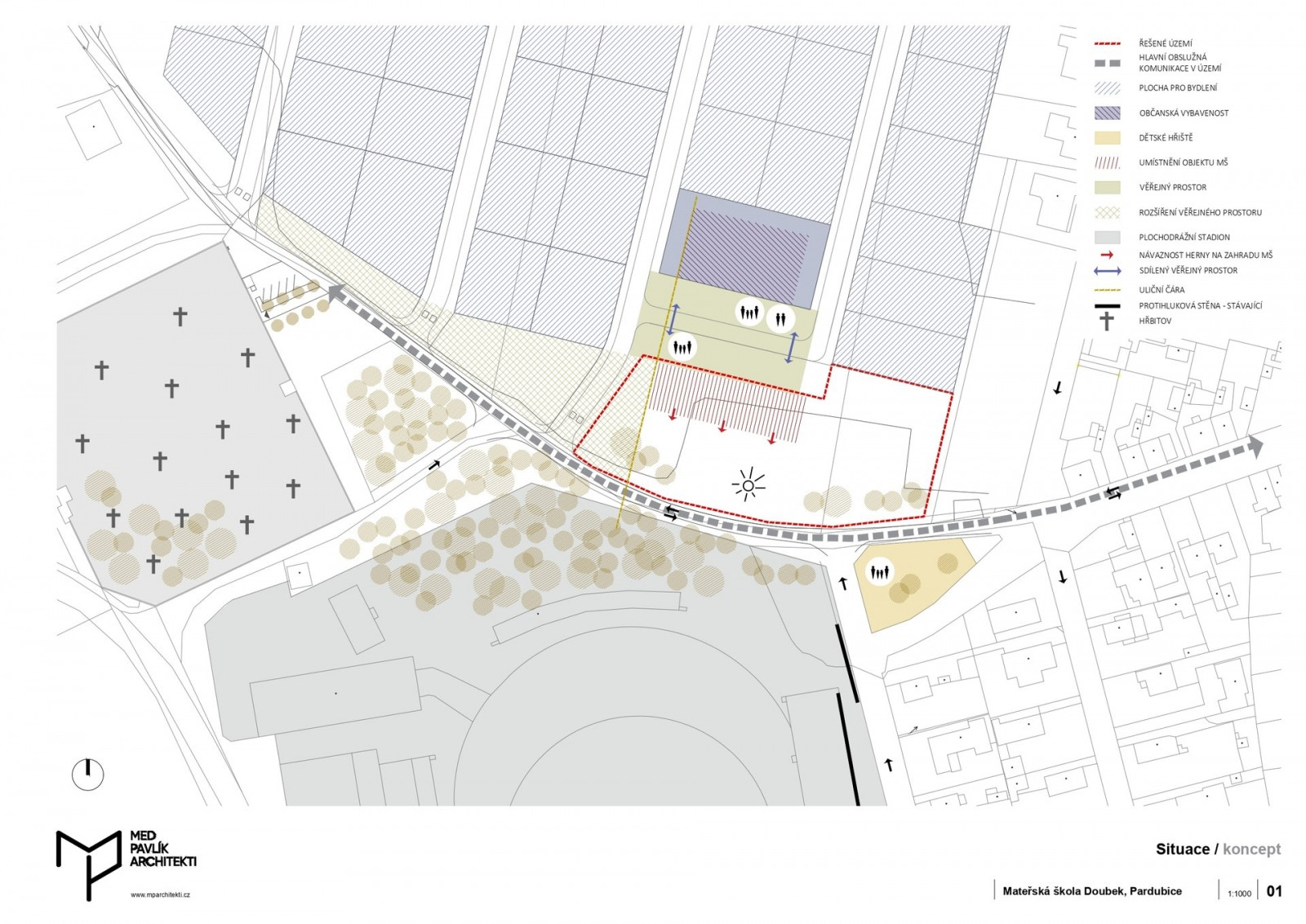 „Znalost území a kontext je pro náš ateliér nezbytná, při zahájení prací na návrhu začátkem roku 2017 jsme však stáli na pozemku, který byl součástí velké louky. Měli jsme v ruce pouze výkres s ideovou představou objednatele o uspořádání okolních veřejných prostorů. Bylo nám zřejmé, že mateřská škola bude mít významnou úlohu ve formování nových veřejných prostor a může ovlivnit atmosféru této části lokality,“ komentují počátek projektu architekti. Mateřská škola stojí ve Svítkově, okrajovém městském obvodu Pardubic. Ten v současnosti prochází změnami, vzniklo zde totiž téměř sto nových parcel pro rodinné domy. Rozvoj oblasti, který iniciuje město Pardubice, počítá i s prostorem pro občanskou vybavenost. A právě jeho součástí je nová školka.