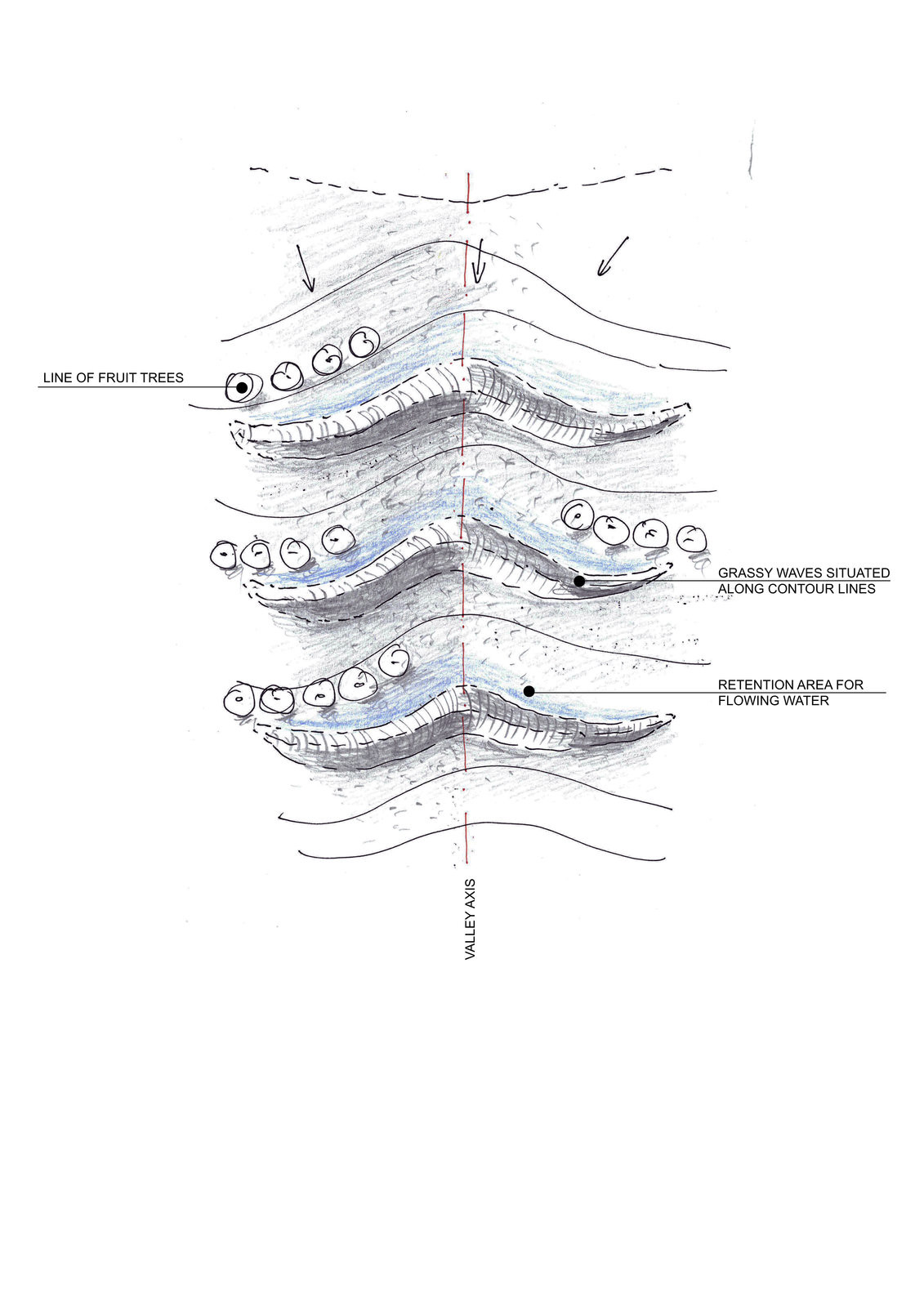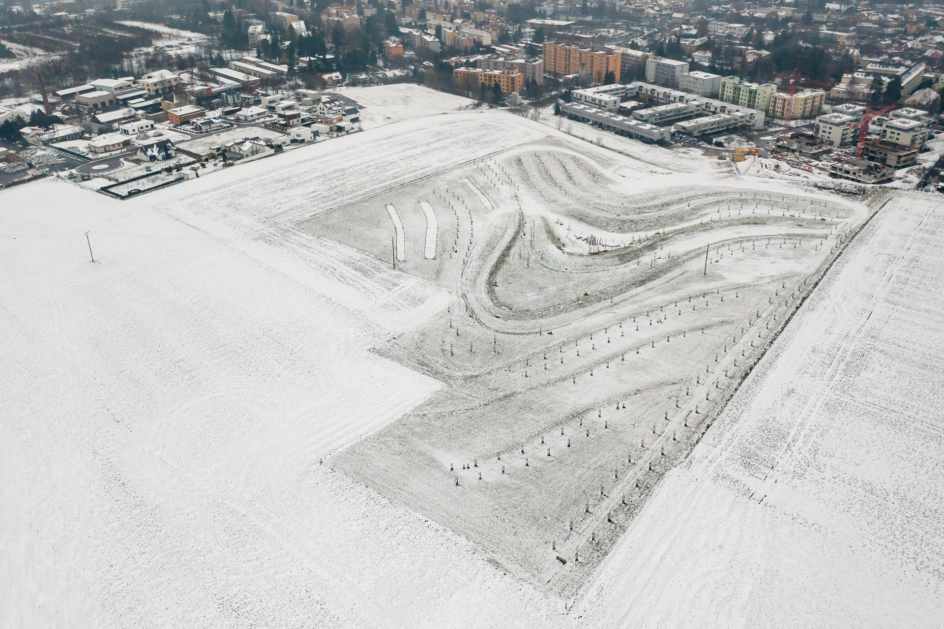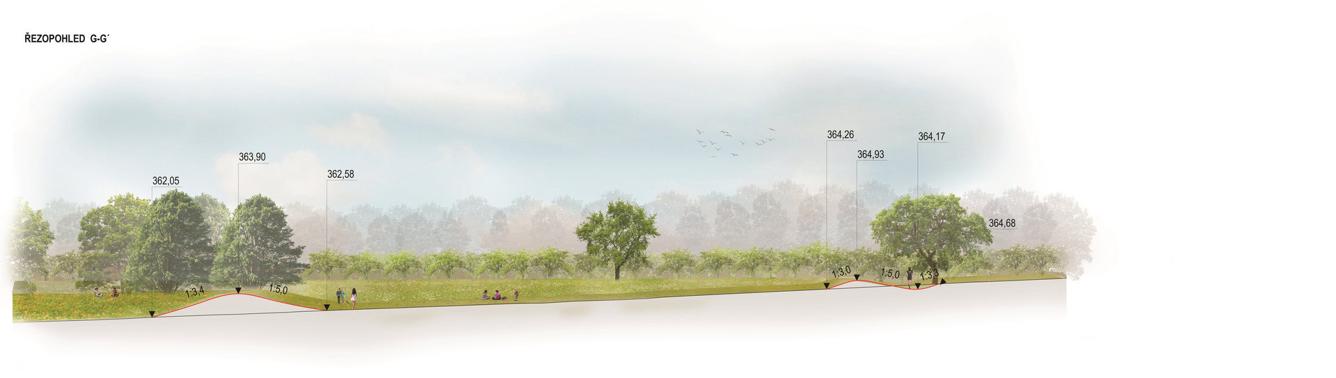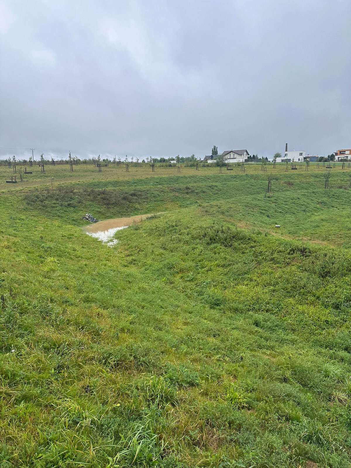 Hledalo se mezi vyzkoušenými vodohospodářskými řešeními, v úvahu připadal nejspíš suchý poldr. Pak ale krajinářská architektka Eva Wagnerová přišla s alternativou – zpomalit vodu terénními úpravami kopce. Po vrstevnicích vznikly terénní vlny a mezi nimi takzvané průlehy. Při dešti se průlehy postupně plní vodou, zadrží až 4000 m3. Voda se se tu zpomalí a může se vsáknout, což trvá údajně do tří dnů. Pak je tu zase zelený travnatý svah.