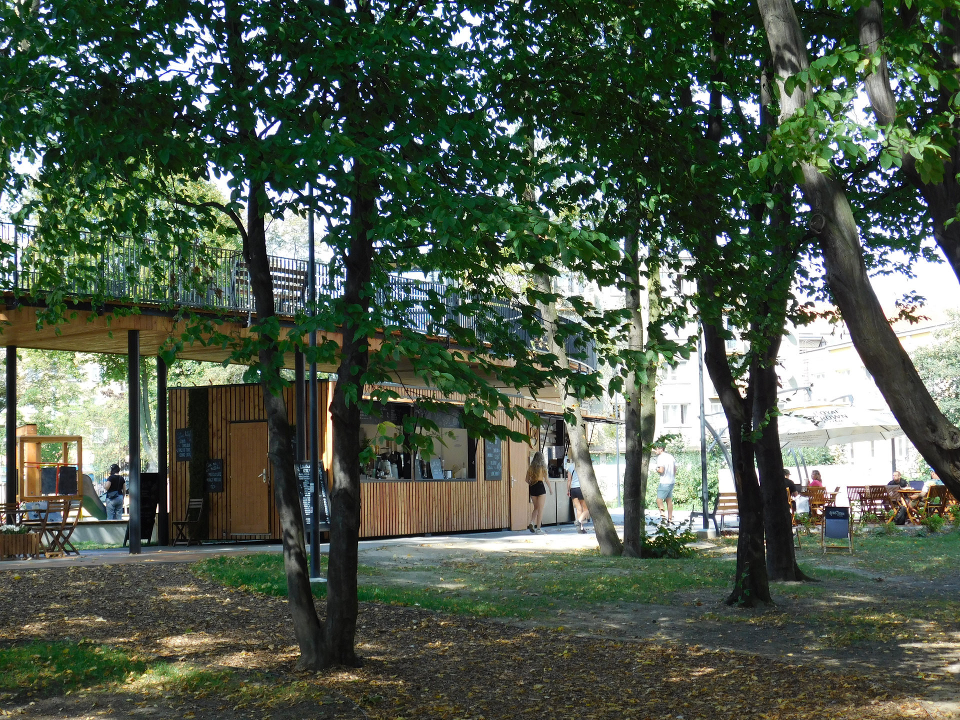 Celý kruh tvoří pomyslnou bariéru pro odpočinkovou zónu uvnitř, kterou si oblíbily hlavně děti. Dovádí na malém hřišti, cachtají se ve fontánce a nechybí jim tu ani mlžítko. Starší pak tráví čas na velkém dřevěném odpočívadle, kde si spolu povídají. Ve stínu pod terasou se mohou návštěvníci schovat před sluncem či špatným počasím. Jsou zde usazeny i tři dřevěné kontejnery. Ty nahradily původní restauraci a podzemní toalety ve špatném stavu. V prvním kontejneru se nachází oblíbený stánek se zmrzlinou, v dalším sídlí bistro s kavárnou, ke kterým přiléhá dřevěné posezení, a v posledním jsou veřejné toalety.