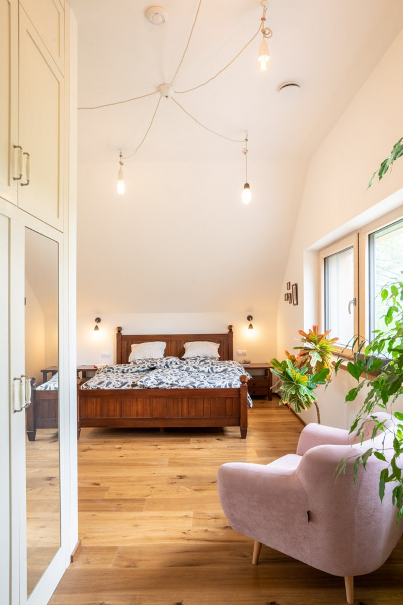 Interiéry domu se nesou ve znamení světlých barev – opět zde dominuje dřevo, které dále doplňují bílé nátěry a obklady stěn. K životu a trávení volného času je vedle přízemí domu možné využívat i jeho obytné podkroví. V přízemí se propojuje prostorný obývací pokoj s kuchyní. Nechybí zde ale ani soukromá pracovna. Podkroví architekti uchopili volnočasově, nachází se zde velký prostor sloužící různorodým aktivitám a ložnice.