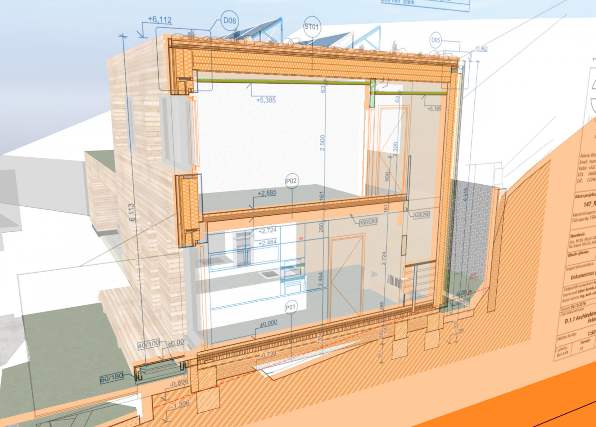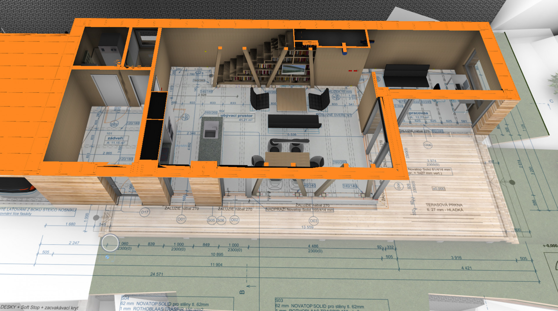 Ve firmě 3AE s.r.o. využíváme BIM díky Archicadu již od počátku naší existence, což je více než 12 let. Začali jsme tvorbou architektonických studií a následně projekcí DSP a DPS. Na začátku jsme se soustředili především na komunikaci s profesemi a výrobcem konstrukčních panelů NOVATOP. Tím ale víceméně naše práce s BIM končila. Po nějaké době jsme dospěli k závěru, že informace, které nám model domu nabízí, můžeme využívat efektivněji a v daleko větší míře. Rozhodli jsme se proto pro větší využití těchto informací a implementovali jsme BIM do celého procesu. Od studie, projekt, obchod přes přípravu až po samotnou realizaci. Nyní nepoužíváme BIM pouze pro efektivní projektování, ale pomocí IFC formátu jsou modely propojeny s rozpočtářským programem, který doplňuje informace potřebné pro obchod a umožňuje nám efektivně vyhodnocovat i ekonomickou stránku modelu. V neposlední řadě je pak BIM využit při přípravě stavby, kdy veškerý materiál je objednáván exportem přímo z modelu. Tento model práce s BIM byl použit i v tomto projektu.