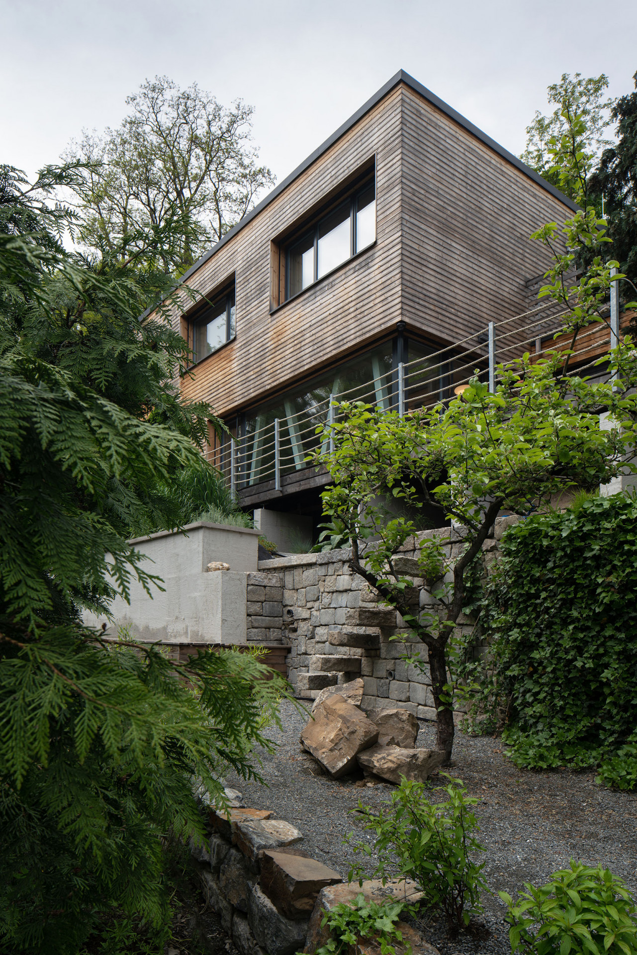 Jedná se o pasivní dřevostavbu z konstrukčního systému NOVATOP. Dům je navržen na místě, kde se nacházel starý zděný dům, který již byl za horizontem své životnosti. Jelikož se pozemek nachází kompletně na skále a velmi prudkém svahu, bylo nutno pracovat s různými úrovněmi, aby vznikl plnohodnotný prostor především pro zahradu. Dům je v souladu s okolní přírodou a citlivě se do ní začleňuje svým usazením i zvolenými materiály.
